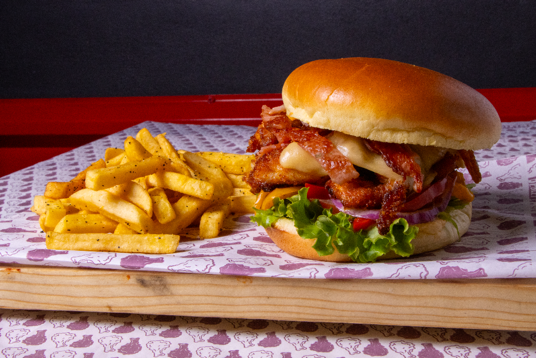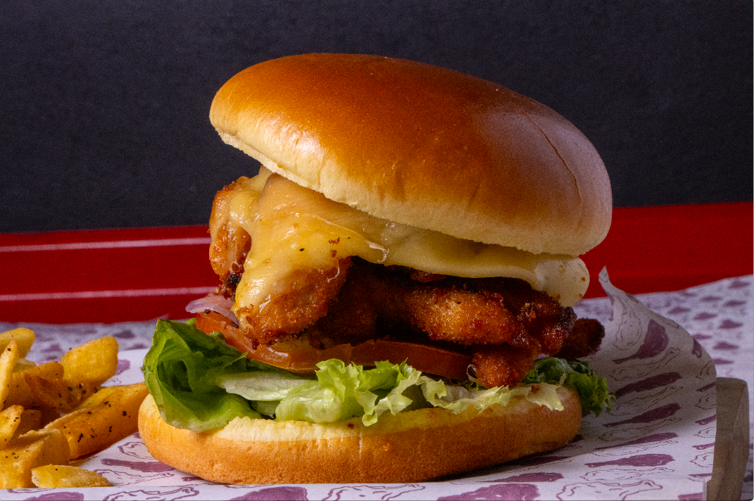 Crocantes 150 g de pechuga de pollo con empanizado de receta propia, queso, lechuga y jitomate. La burger que levanta el ánimo y el antojo, con 220 g de papas a la francesa.