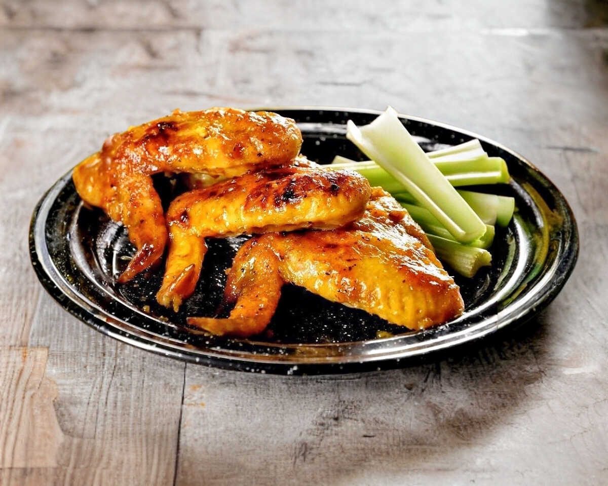 Ricas alitas sabor tamarindo con habanero (7 piezas), cama de lechuga, ranch, zanahoria y apio.