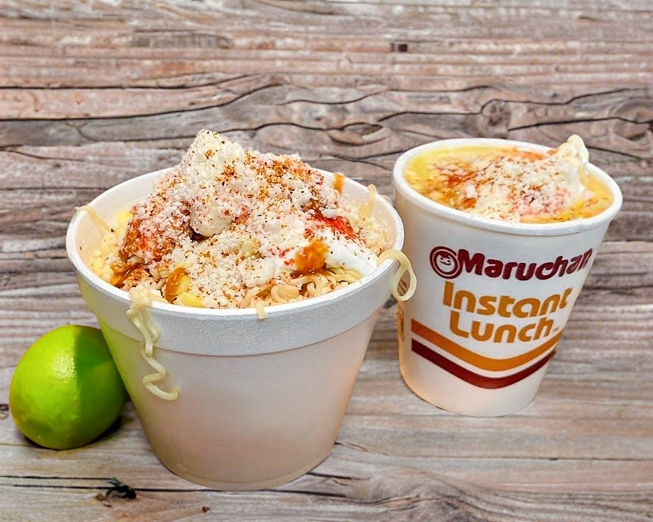 MARUCHAN DE POLLO PICANTE (RAMEN), CON ELOTE, QUESO, MAYONESA, LIMON Y CHETOS FLAMIN HOT