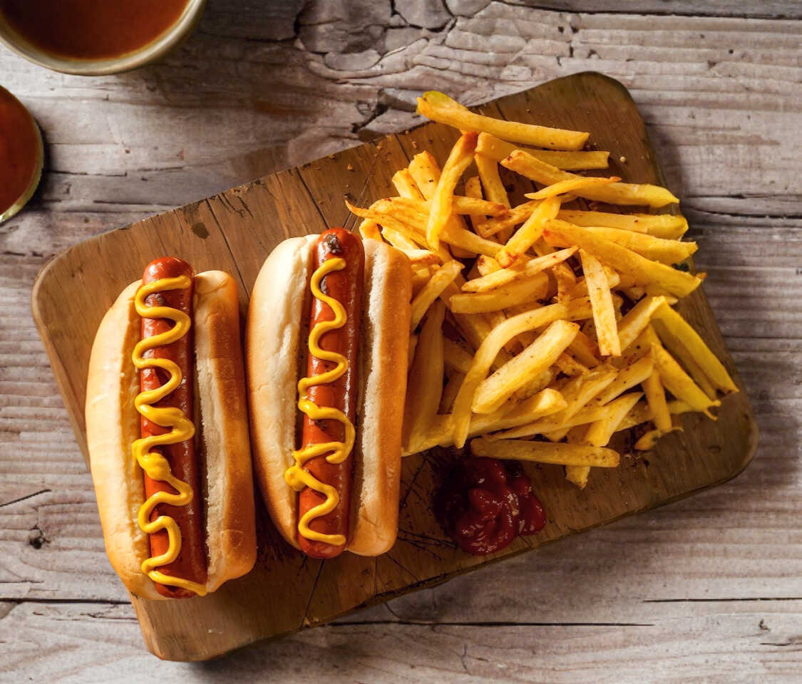 2 hotdogs envueltos con tocino mas porcion de papas