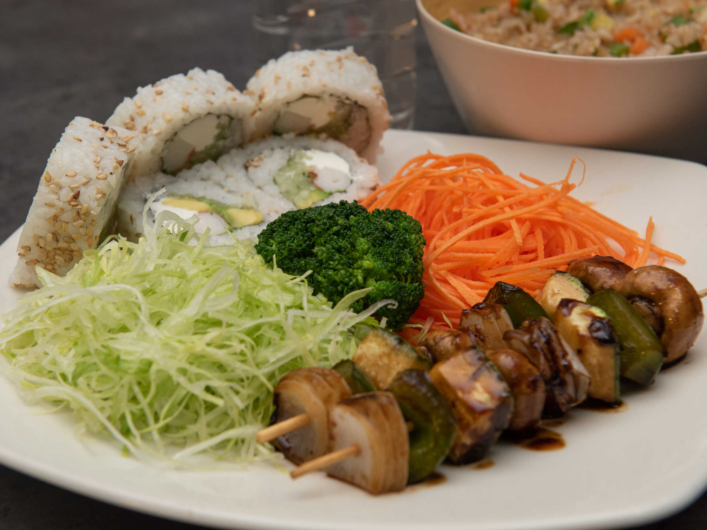 Yakimeshi con verduras, media california de surimi, 2 brochetas de verduras 1 una botella de agua.