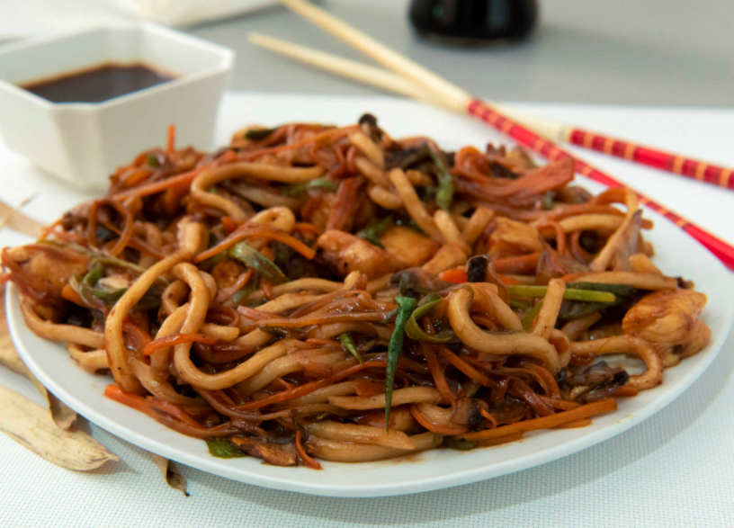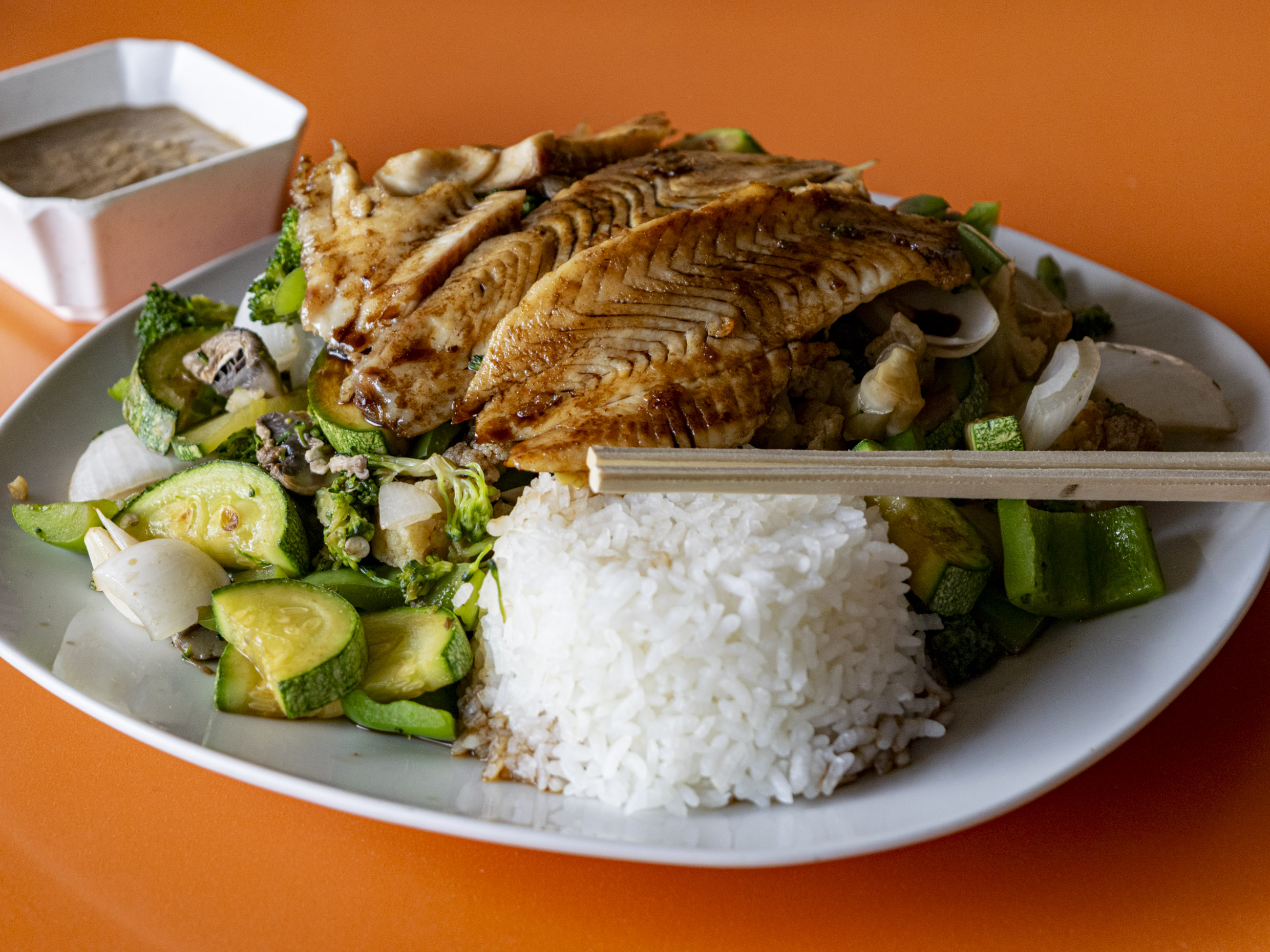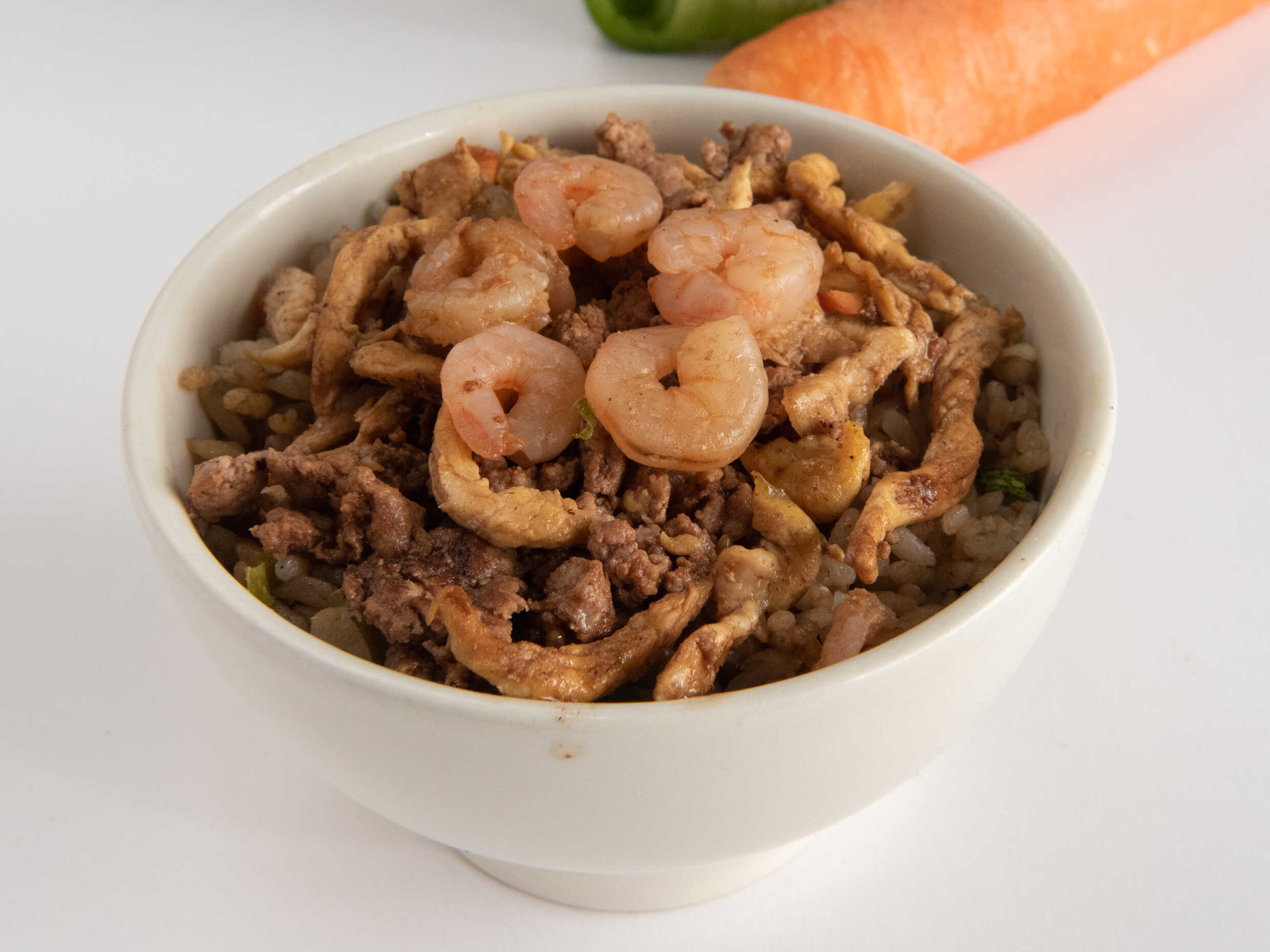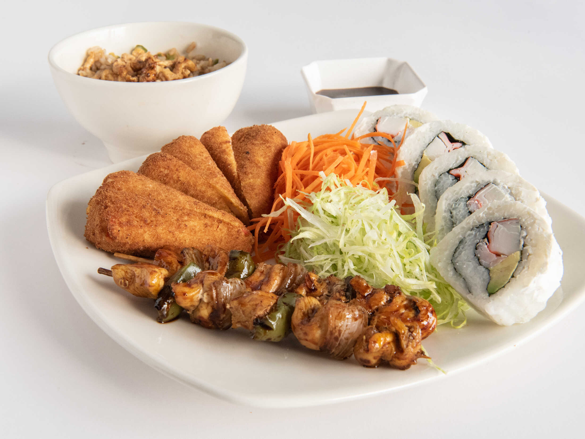 Medio yakimeshi con pollo, medio california de surimi, 3 brochetas, 1 bola de helado y refresco.