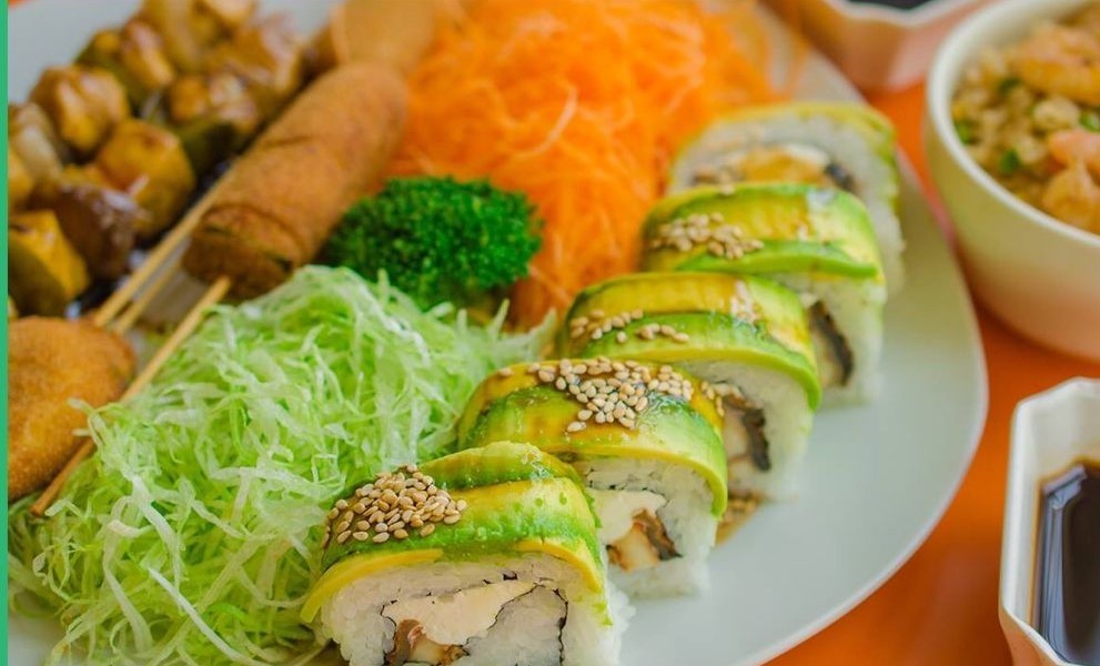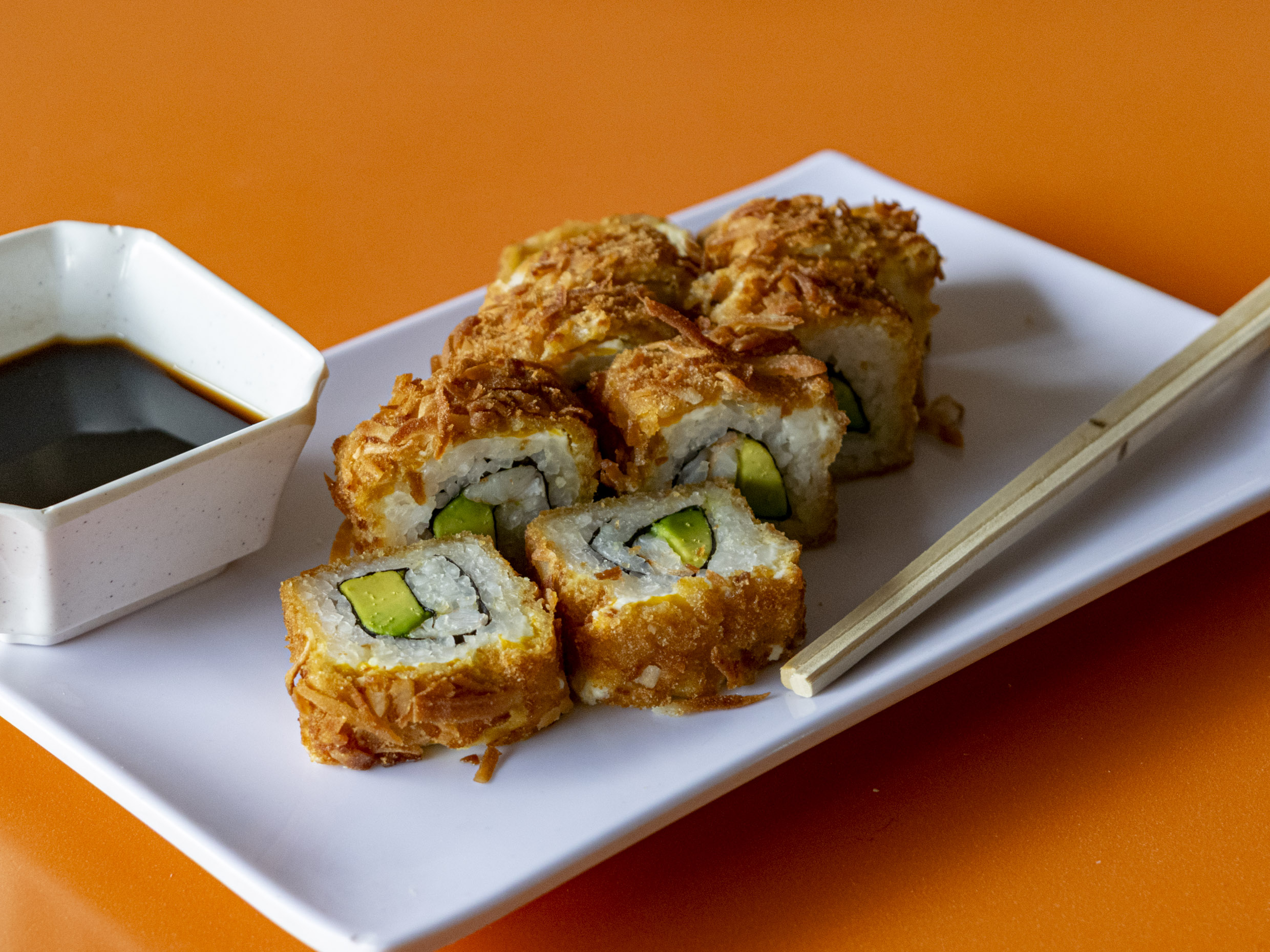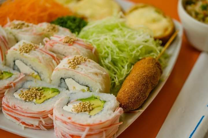 Chiles toreados, kakiague, surimi, aguacate con yakimeshi y queso por fuera.