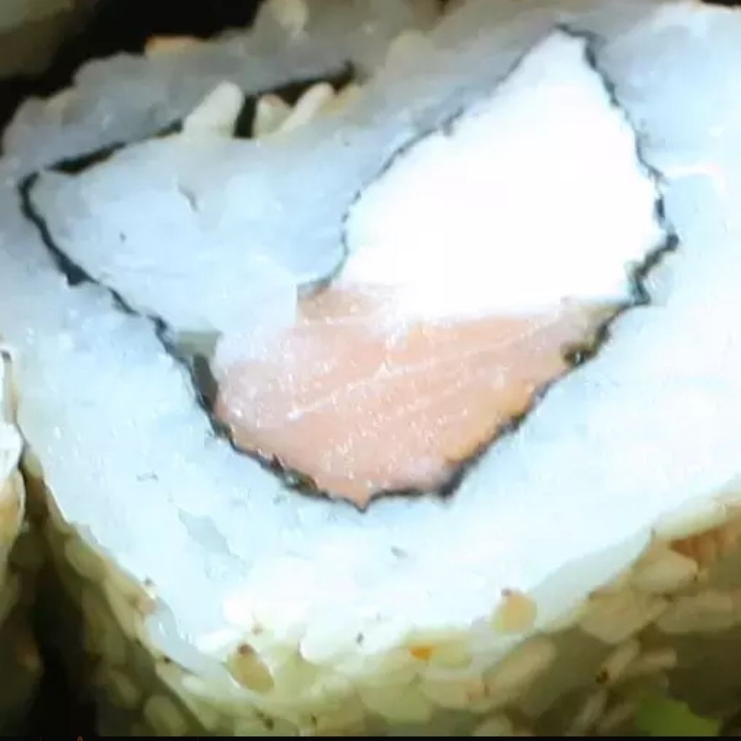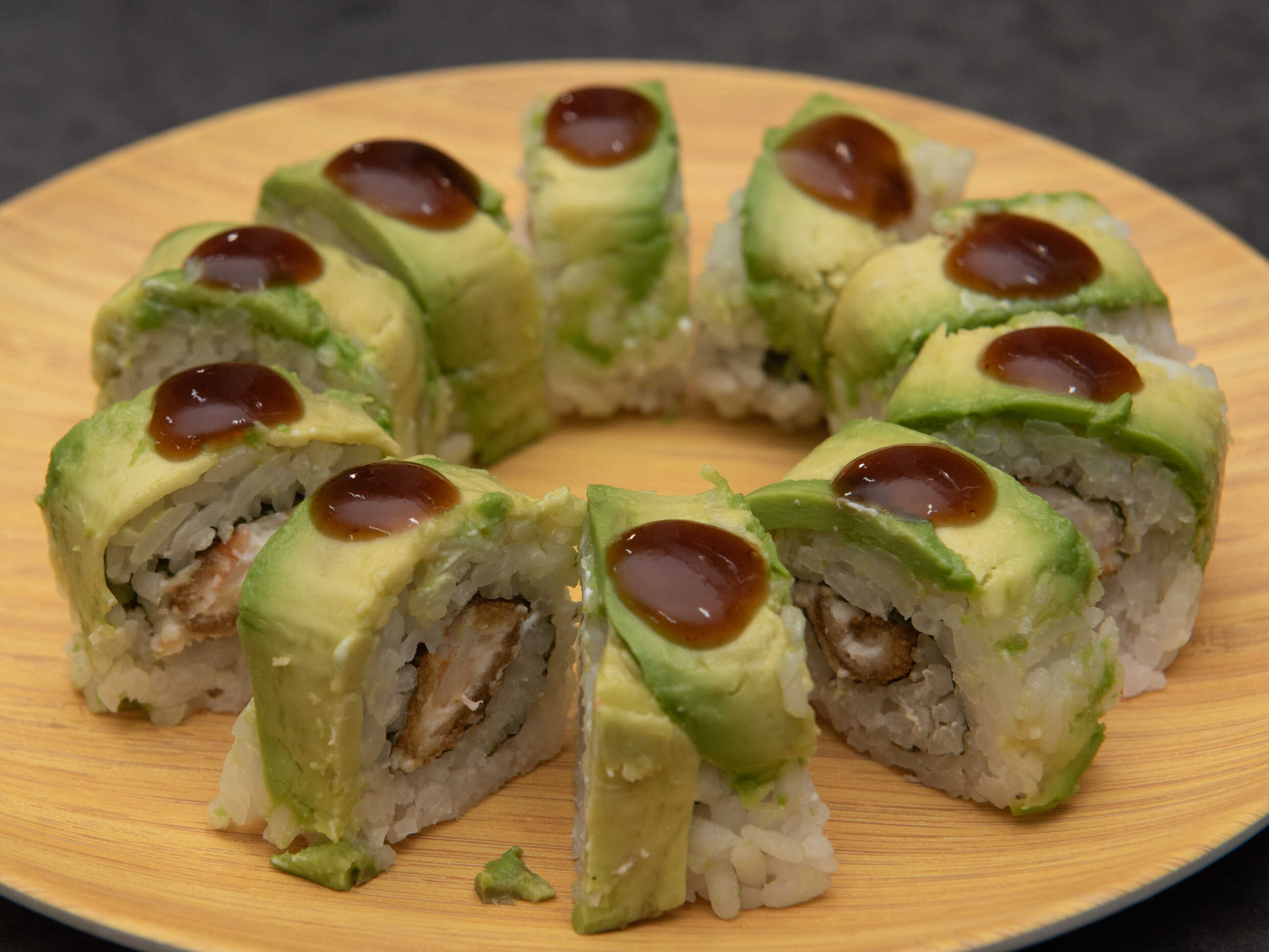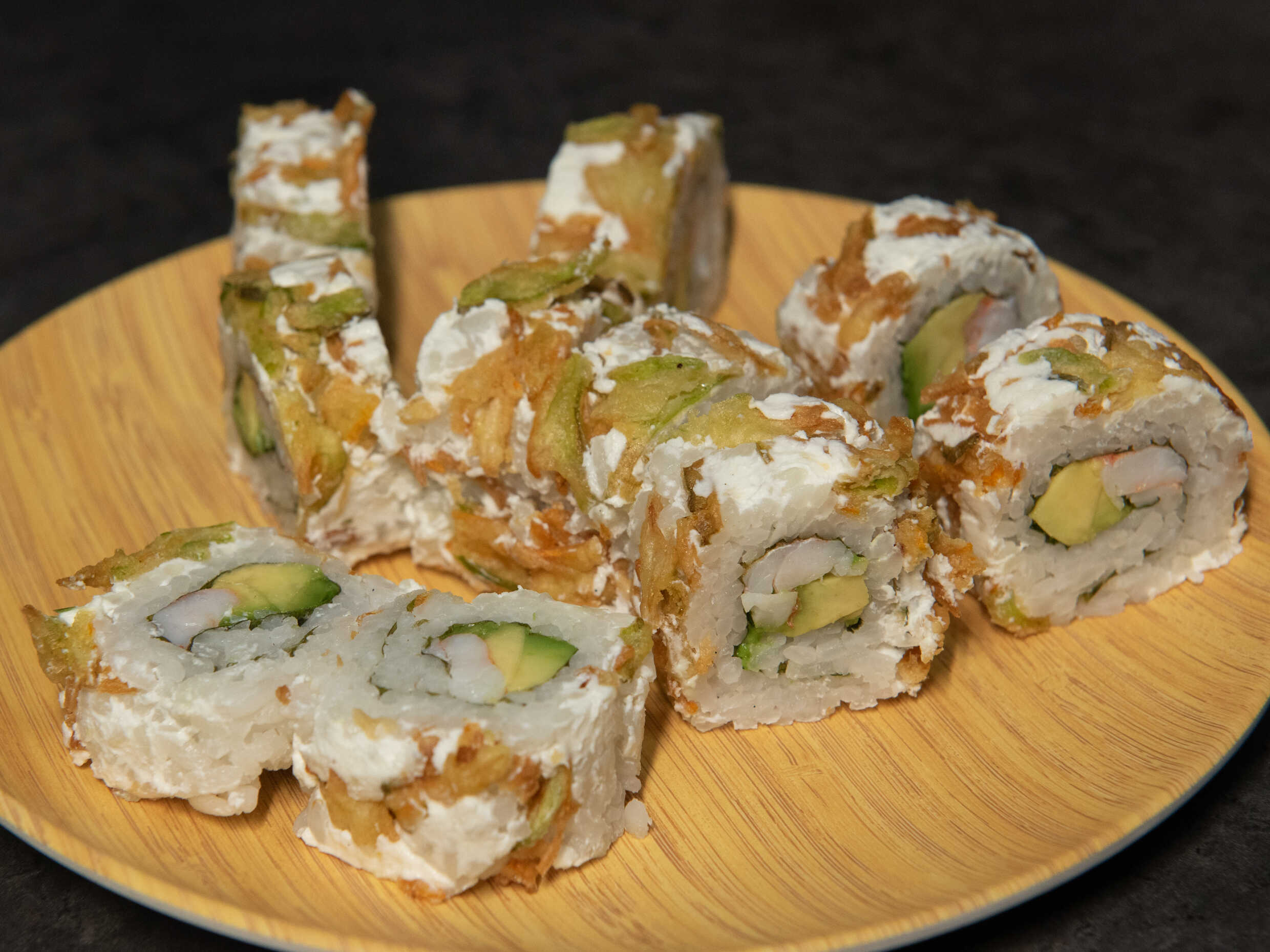 Rollo empanizado con surimi, aguacate y queso crema, 10 piezas por rollo.