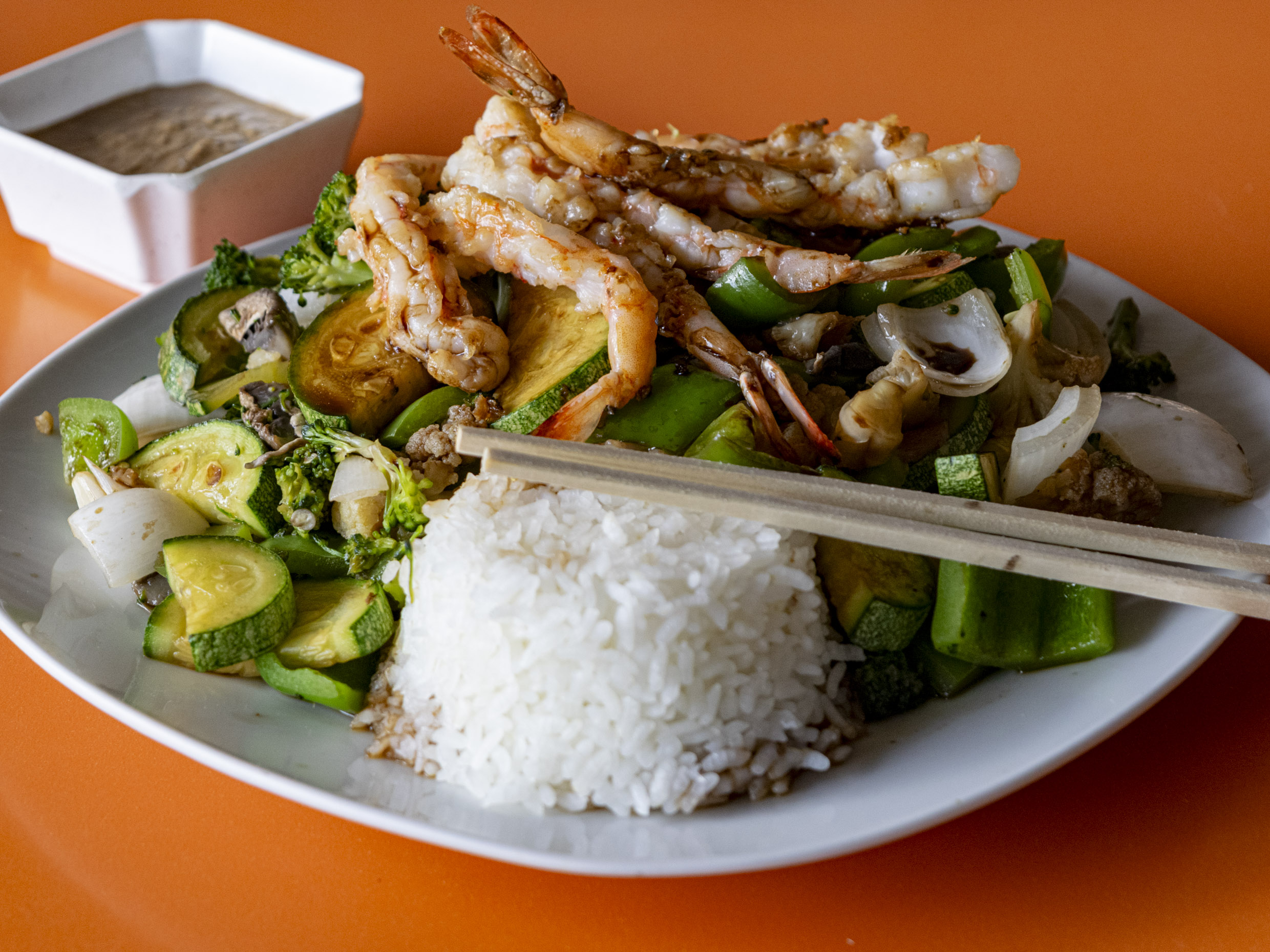 Morrón verde, cebolla, calabaza, champiñón, coliflor, brócoli y 8 piezas de camarón.