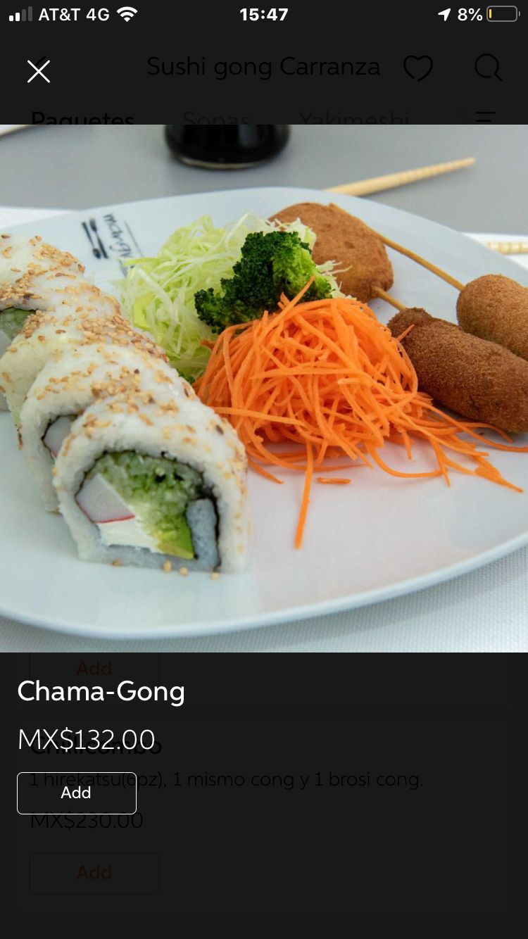 2 Brochetas, 1 yakimeshi con pollo, 3 torikatsu y 1 refresco.