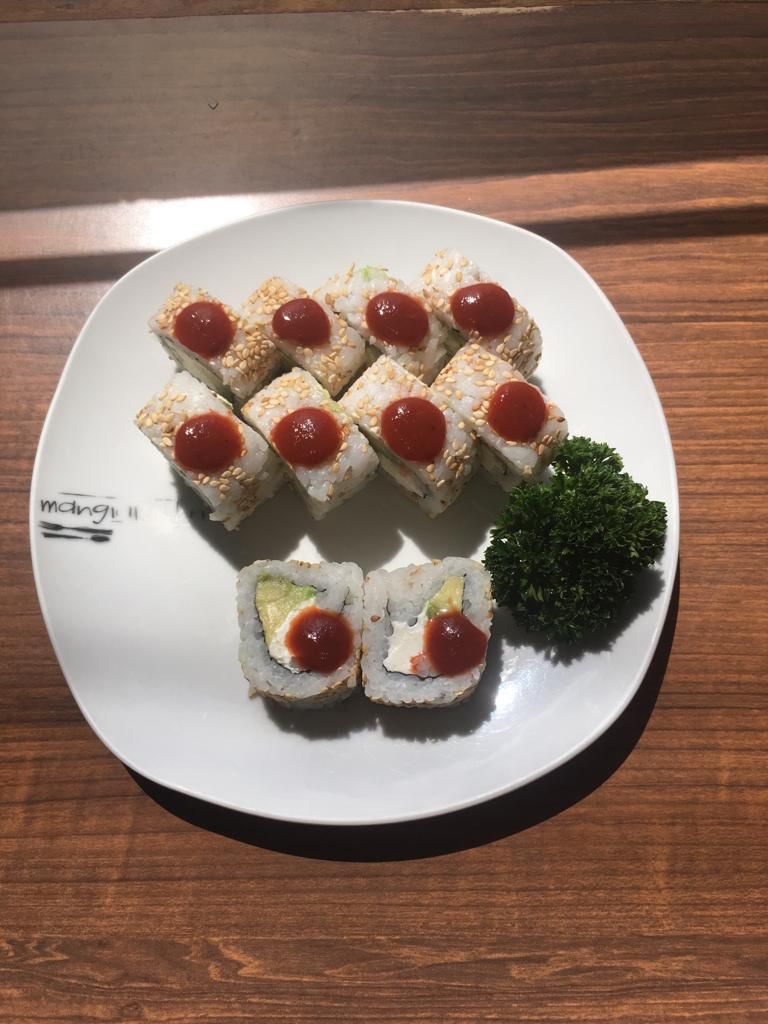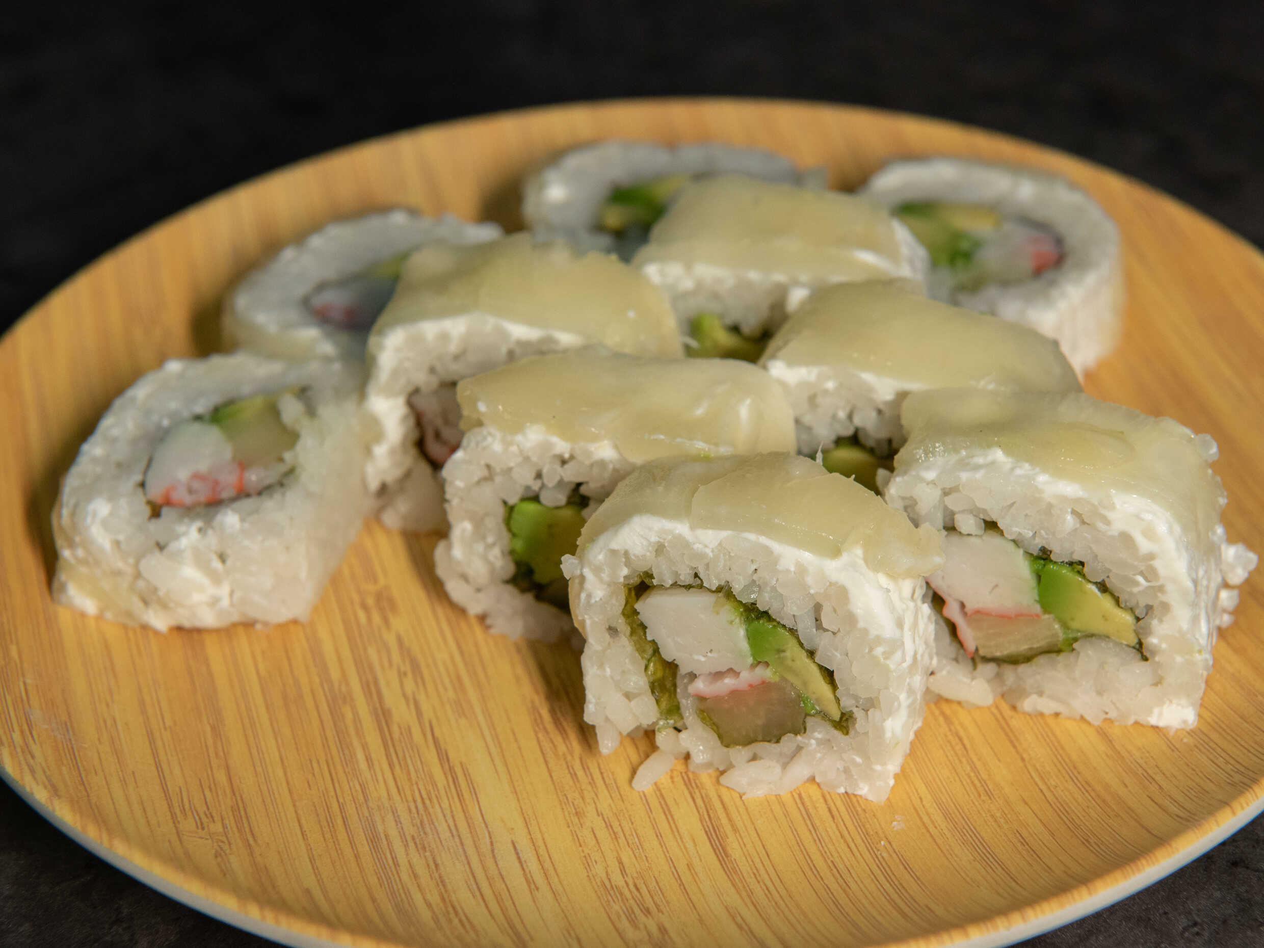 Aguacate, chiles toreados, cebollín, salmón con queso por fuera y mazago.
