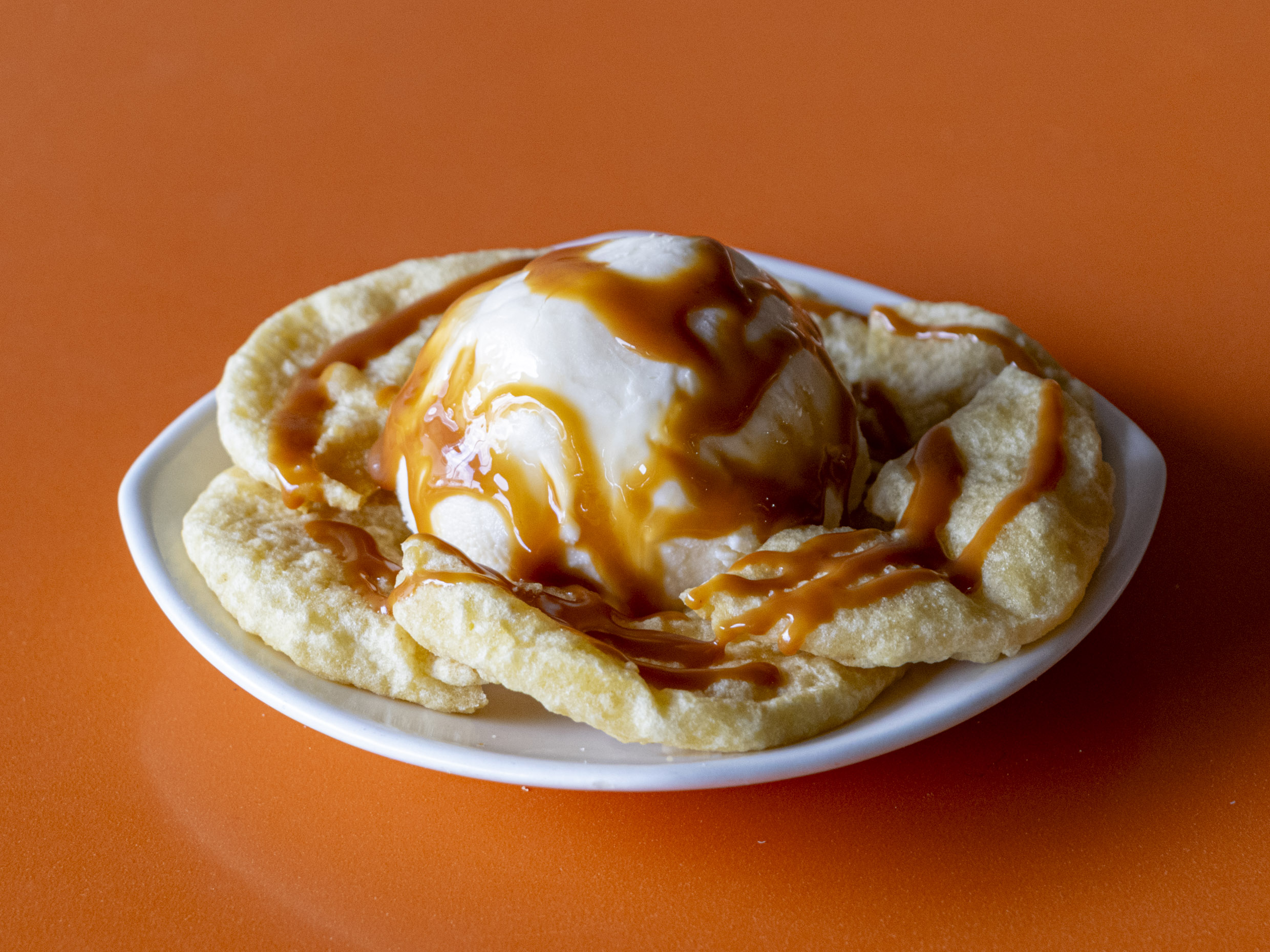 Camarón, aguacate, queso, por fuera mango con coco empanizado.