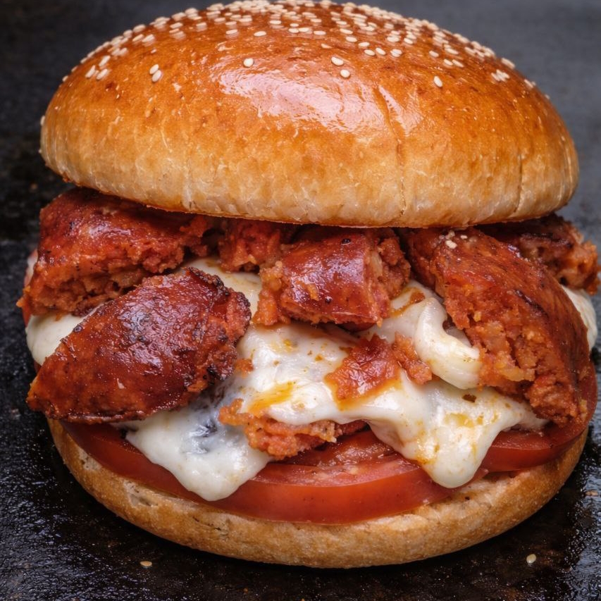 150g de nuestra exclusiva Carne Picante con queso Oaxaca real fundido en hebras. Incluye jitomate y cebolla en pan artesanal. •Elige tu toque final entre Aderezo de Chipotle (picante cremoso) o Spicy BBQ (dulce-picante intenso).