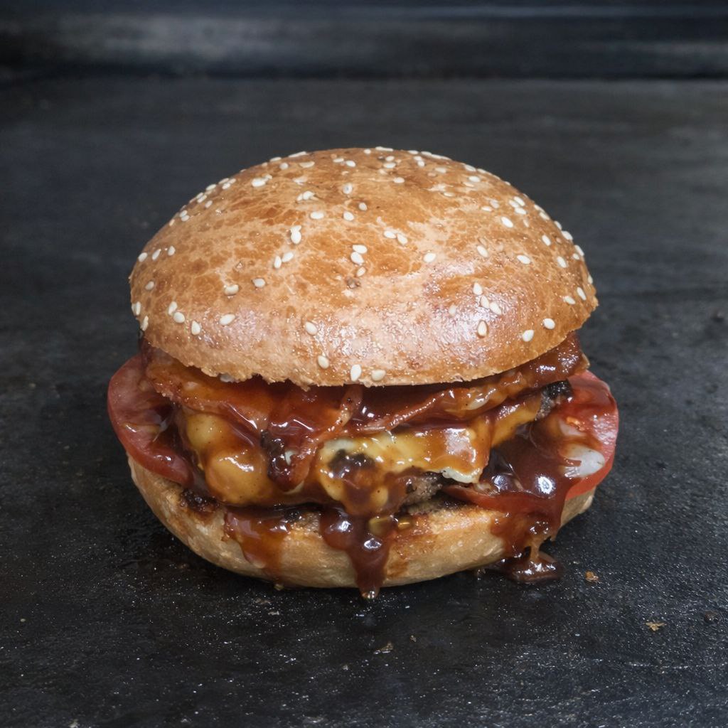 150g de res seleccionada sellada a la plancha para máxima jugosidad. Coronada con tocino crujiente, queso manchego fundido y nuestra salsa BBQ artesanal de la casa. Servida con jitomate, cebolla y jalapeño en pan artesanal tostado.