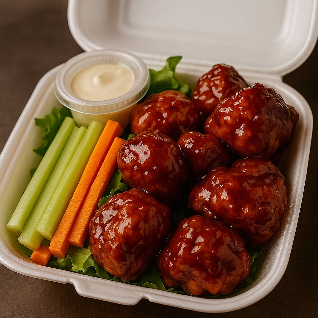 6 Piezas de alitas, con guarnición de pepino y zanahoria con una cama de lechuga y un vaso de aderezo ranch.