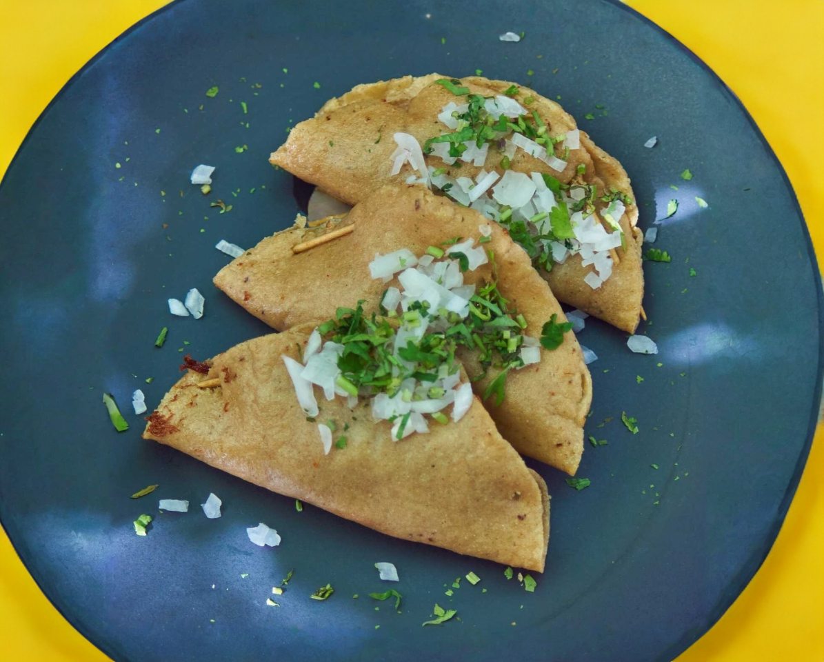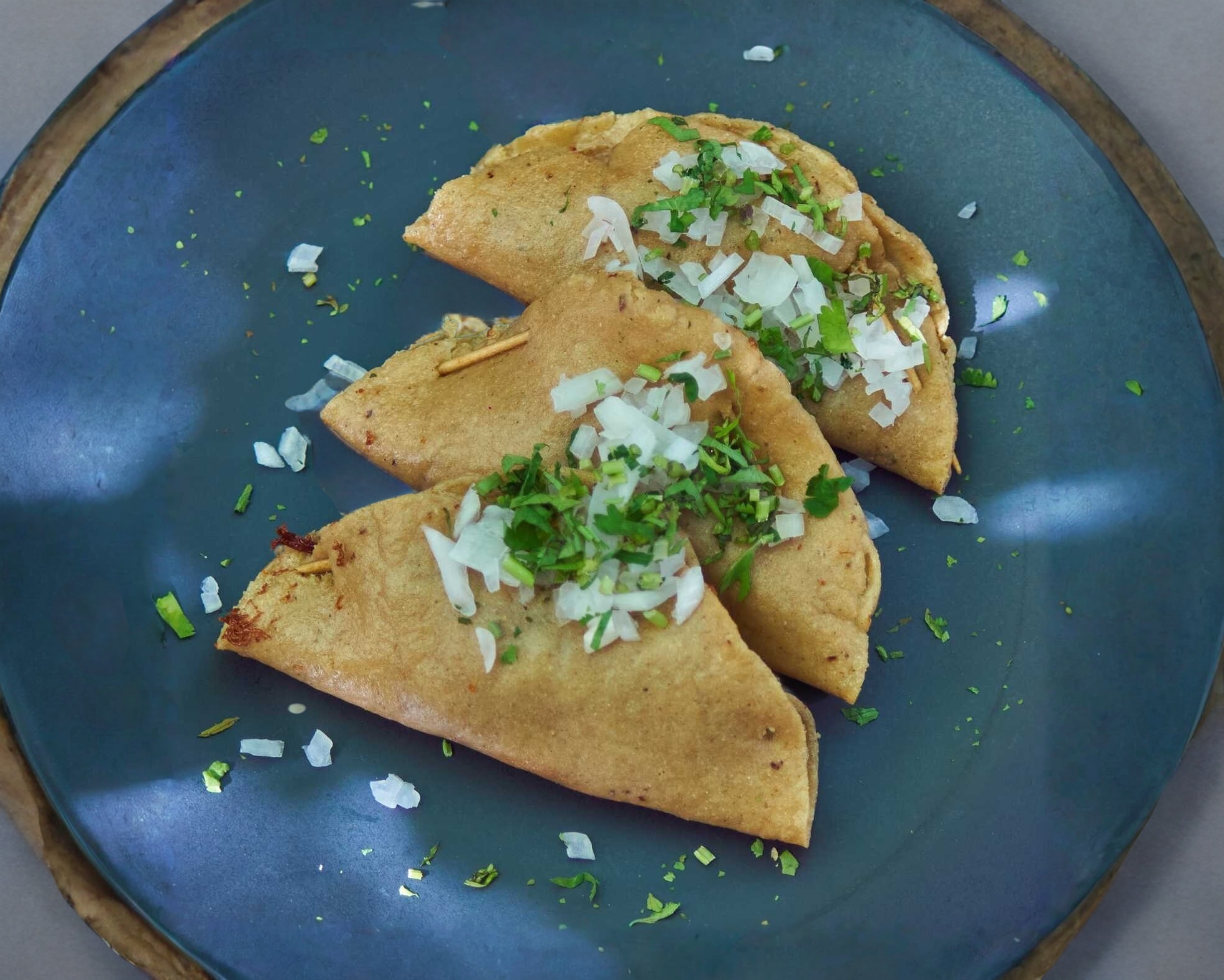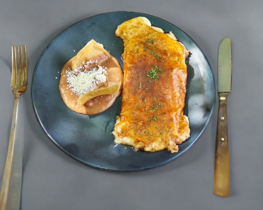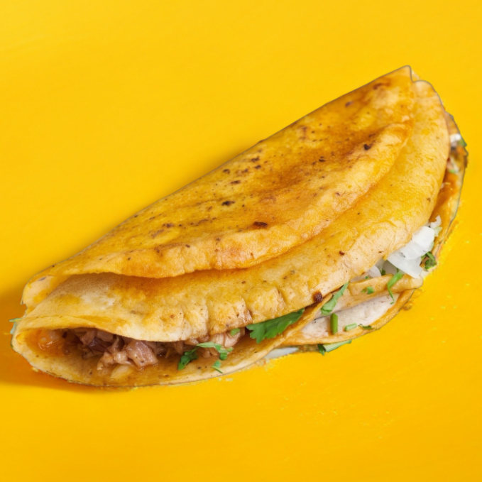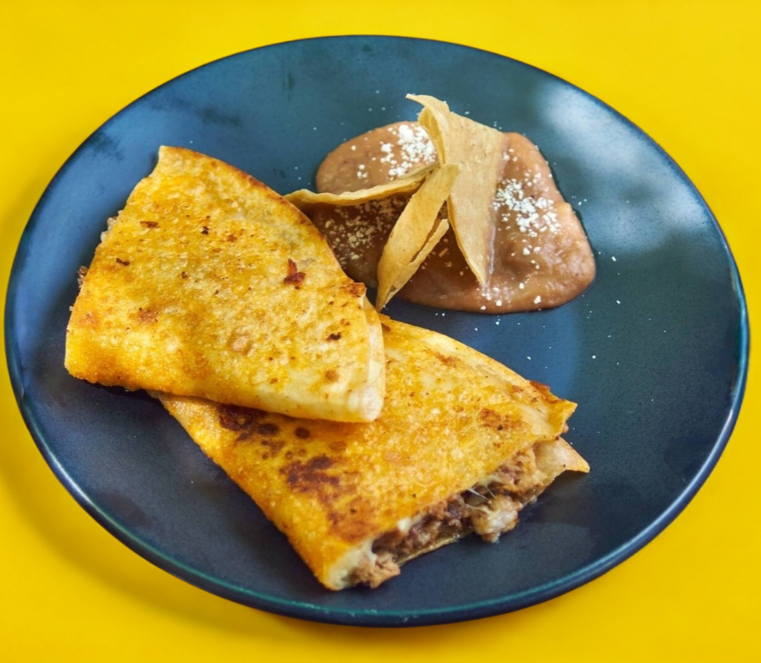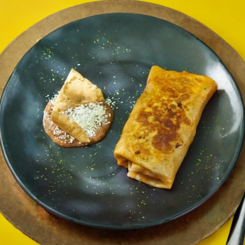 Tortilla dorada y crujiente rellena de frijoles refritos con chipotle, queso y carne de birria, una combinación clásica que no falla.