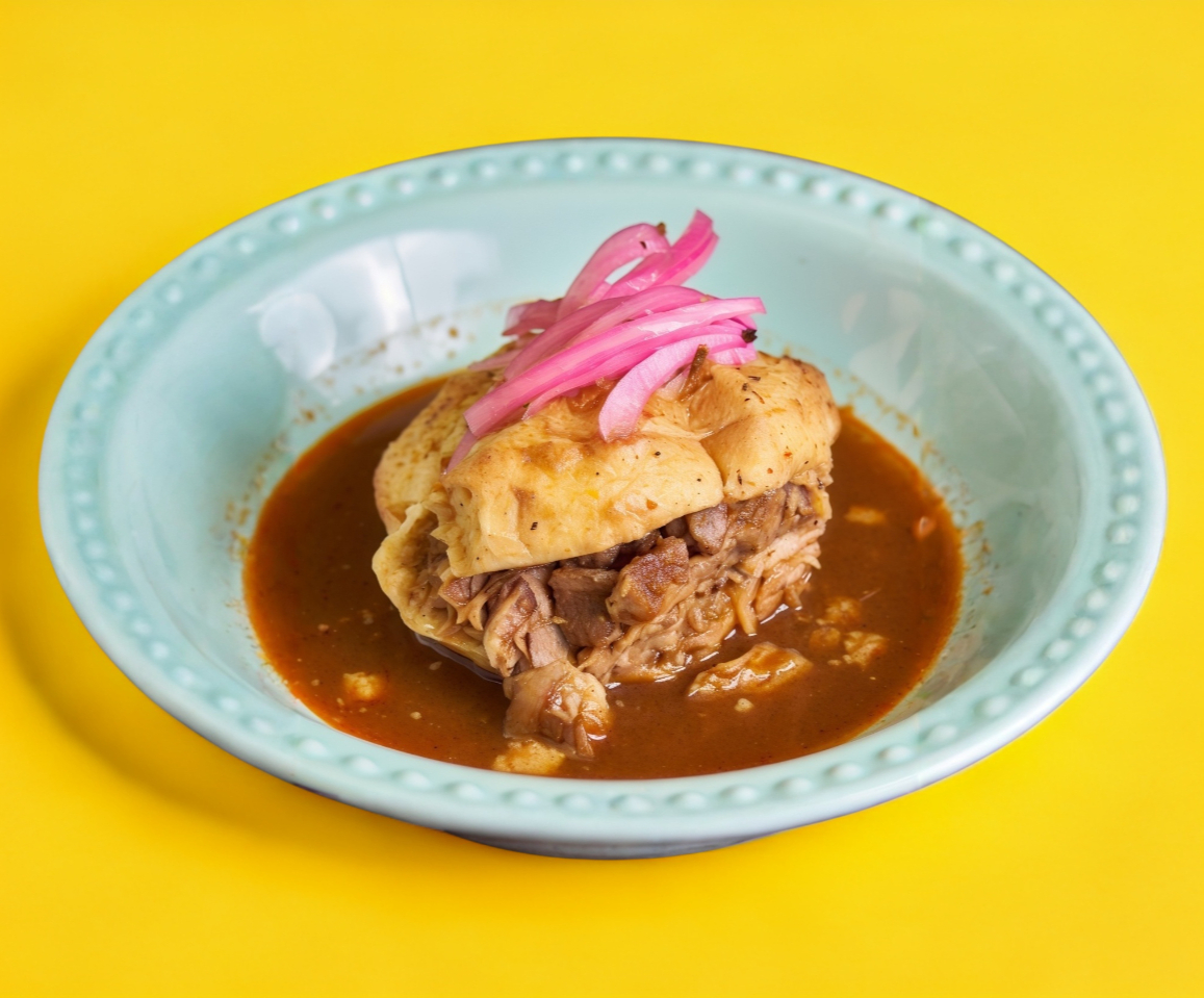 Nuestra versión de la tradicional torta ahogada, elaborada con pan crujiente y rellena de nuestra jugosa birria de res deshebrada.