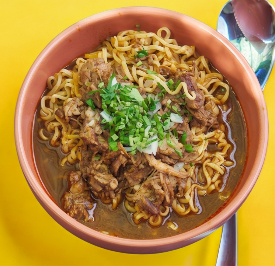 Deliciosa fusión de sabores: ramen al estilo mexicano con caldo de birria, trozos de carne suave y jugosa, y fideos al dente