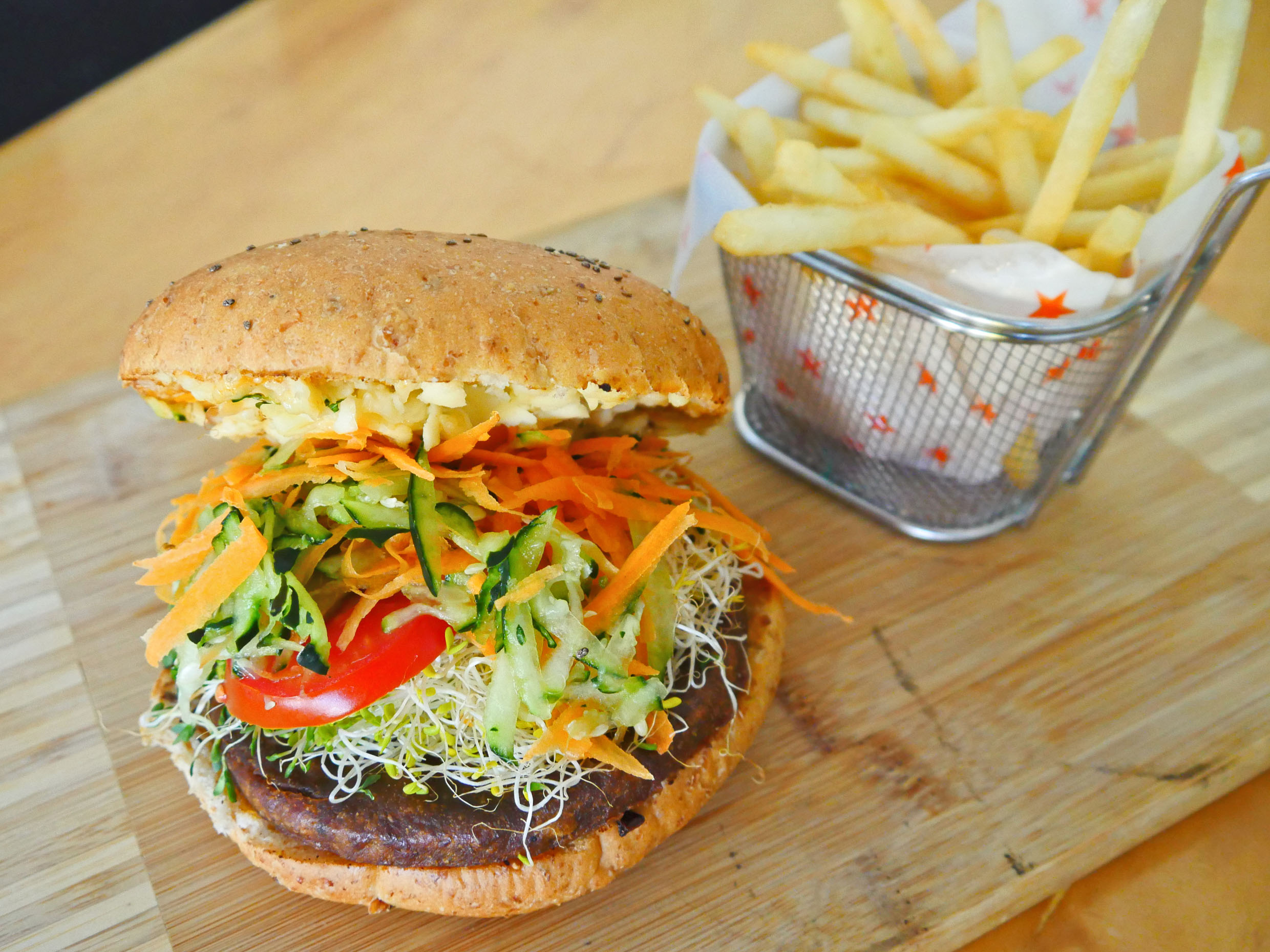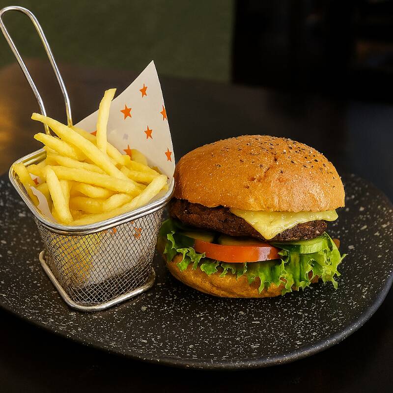 Hamburguesa acompañada con aderezo vegano, pepino, jitomate, lechuga, rajas, queso gouda o vegano.