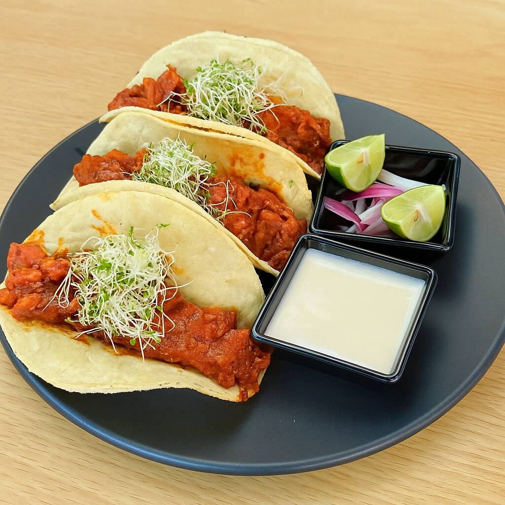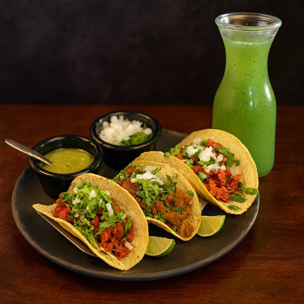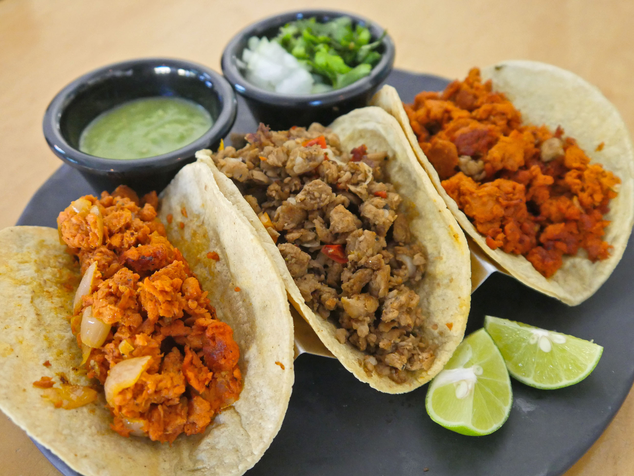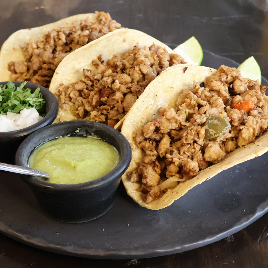 3 tacos (1 de pastor, 1 de chorizo y 1 de alambre) todos a base de soya acompañados con cilantro, cebolla y salsa de la casa.