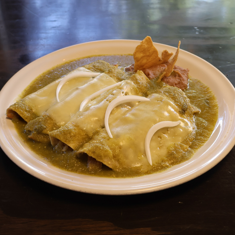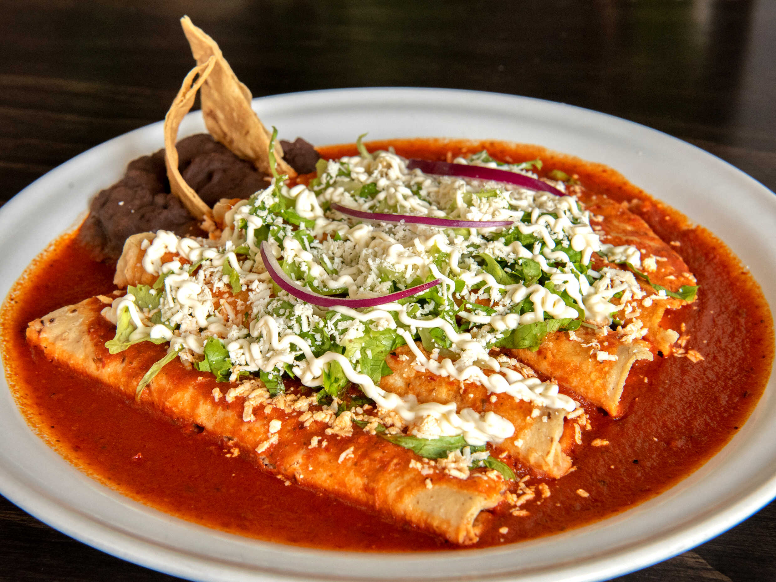 Bañadas en salsa verde o roja con cebolla morada, lechuga, queso vegano o queso cotija y crema. acompañadas de frijolitos refritos de la casa.