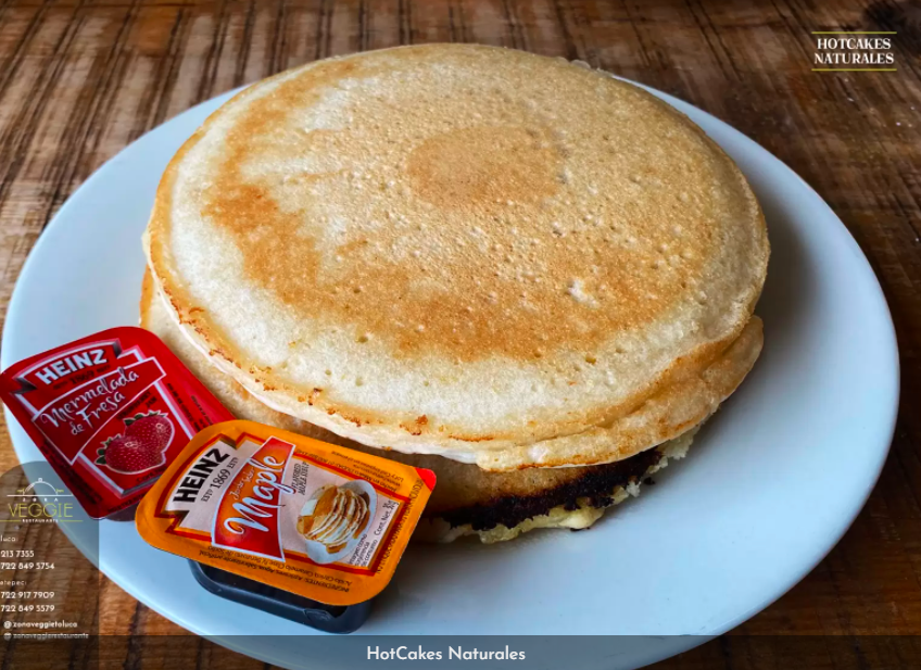 Deliciosos hot cakes veganos acompañados con mermelada de fresa. 2 Piezas.