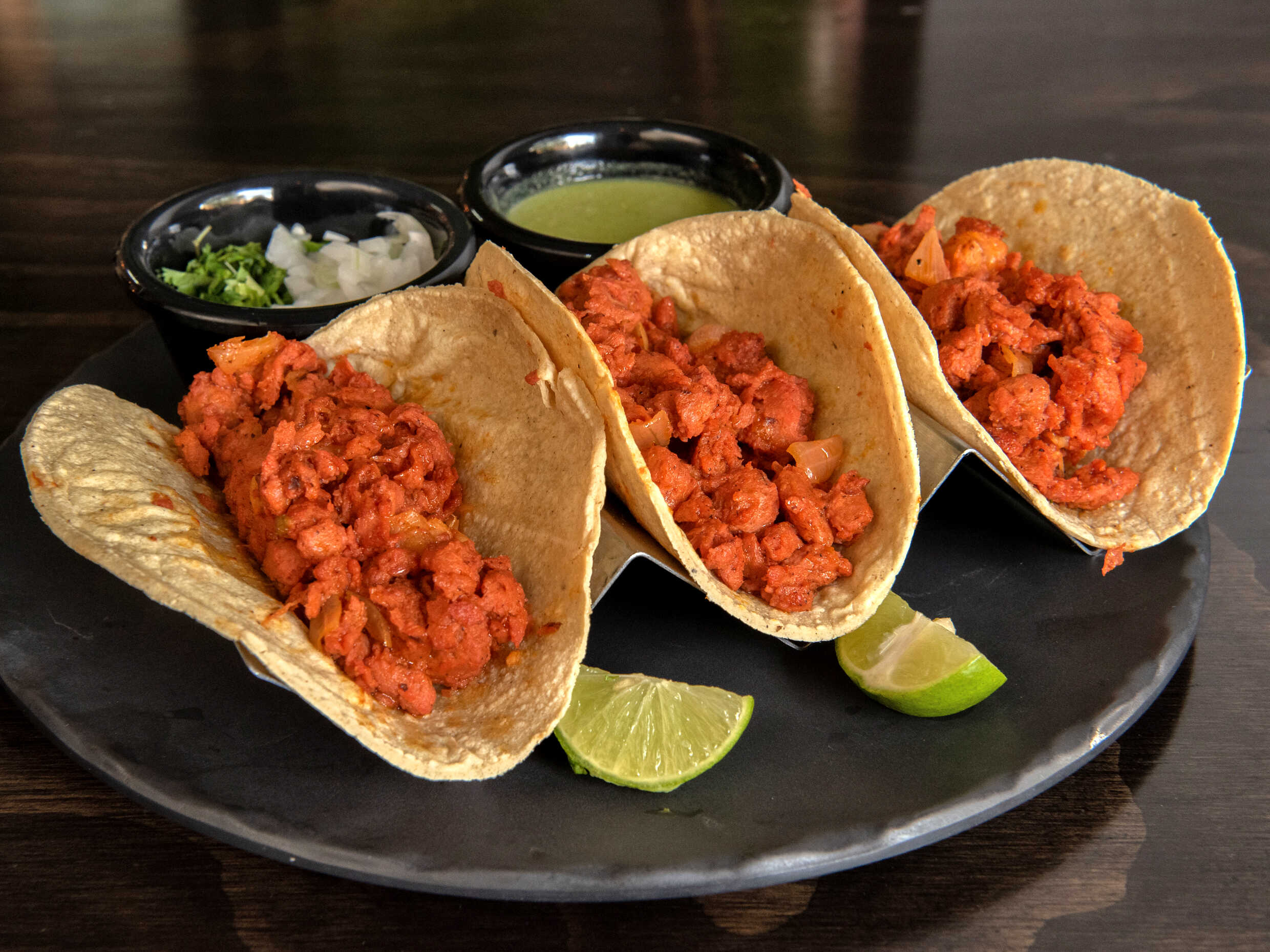 Tacos de pastor a base de soya vegano acompañados con cilantro, cebolla y salsa de la casa.