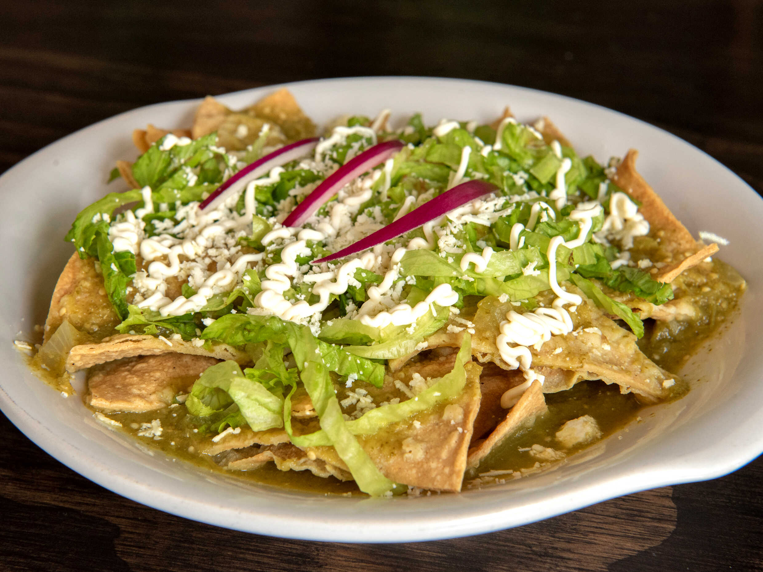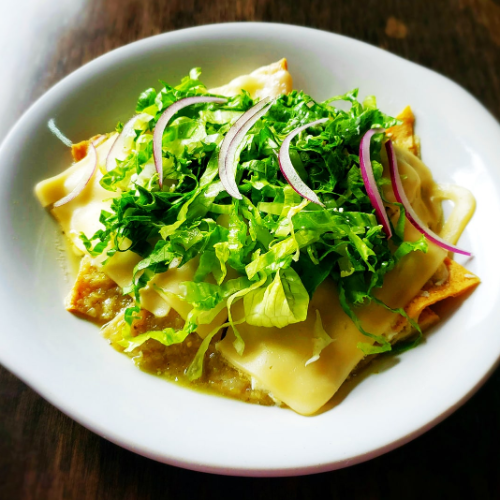 Totopos bañados en salsa verde o salsa roja con queso vegano o queso cotija y crema, cebolla morada y lechuga.