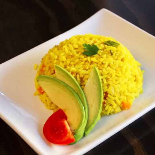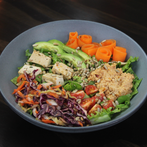 Bowl con delicadas rebanadas de aguacate, jitomate cherry, tofu, zanahoria, ensalada de col y semilla de girasol, con de lechuga y arroz en cúrcuma.