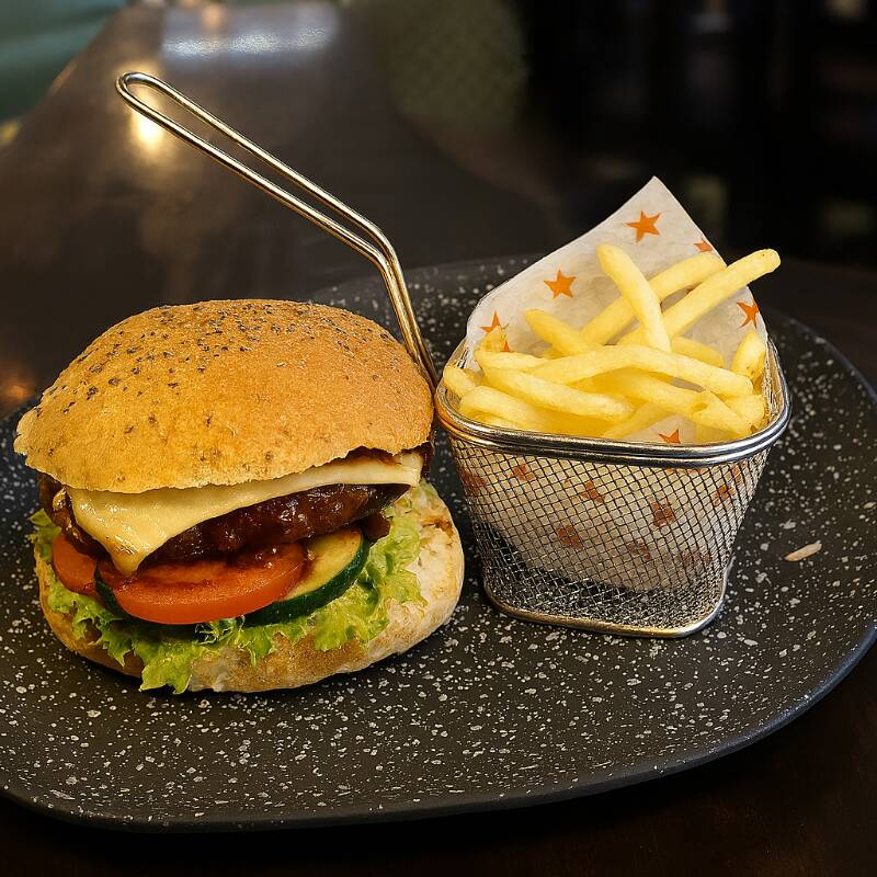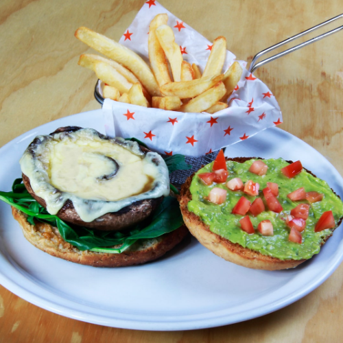 Deliciosa hamburguesa de portobello con queso gouda gratinado, acompañado con ensalada de espinaca, arúgula, kale y guacamole de la casa, acompañado de papas a la francesa.