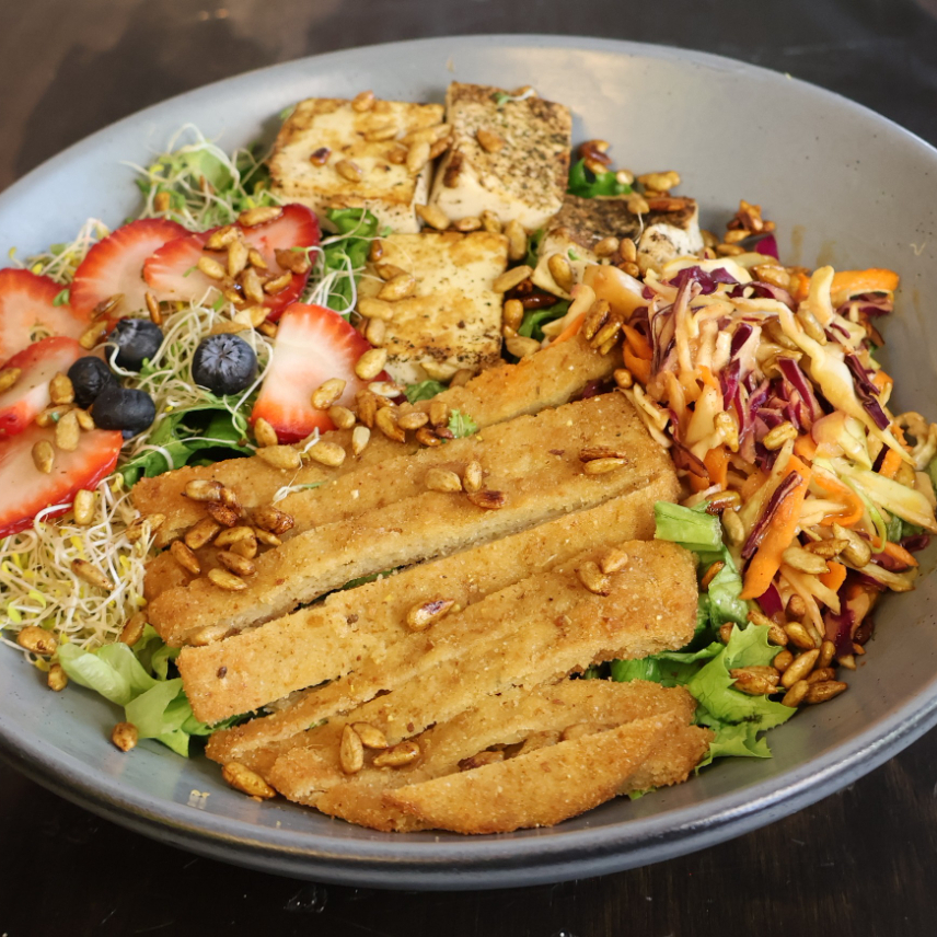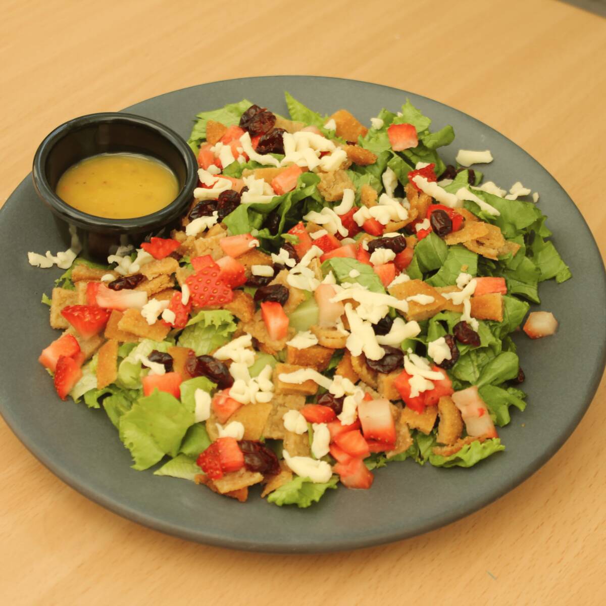 Ensalada con deliciosa fresa, arándanos, milanesa de amaranto (vegana), queso vegano con base de lechuga italiana y aderezo de ajonjolí vegano.