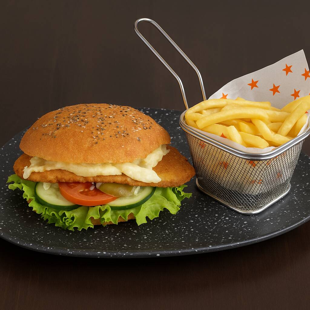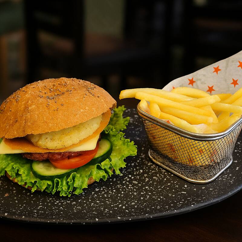 Delciosa hamburguesa de lenteja acompañada de germinado de alfalfa, jitomate, pepino, chiles en vinagre y queso vegano. Acompañada de papas.