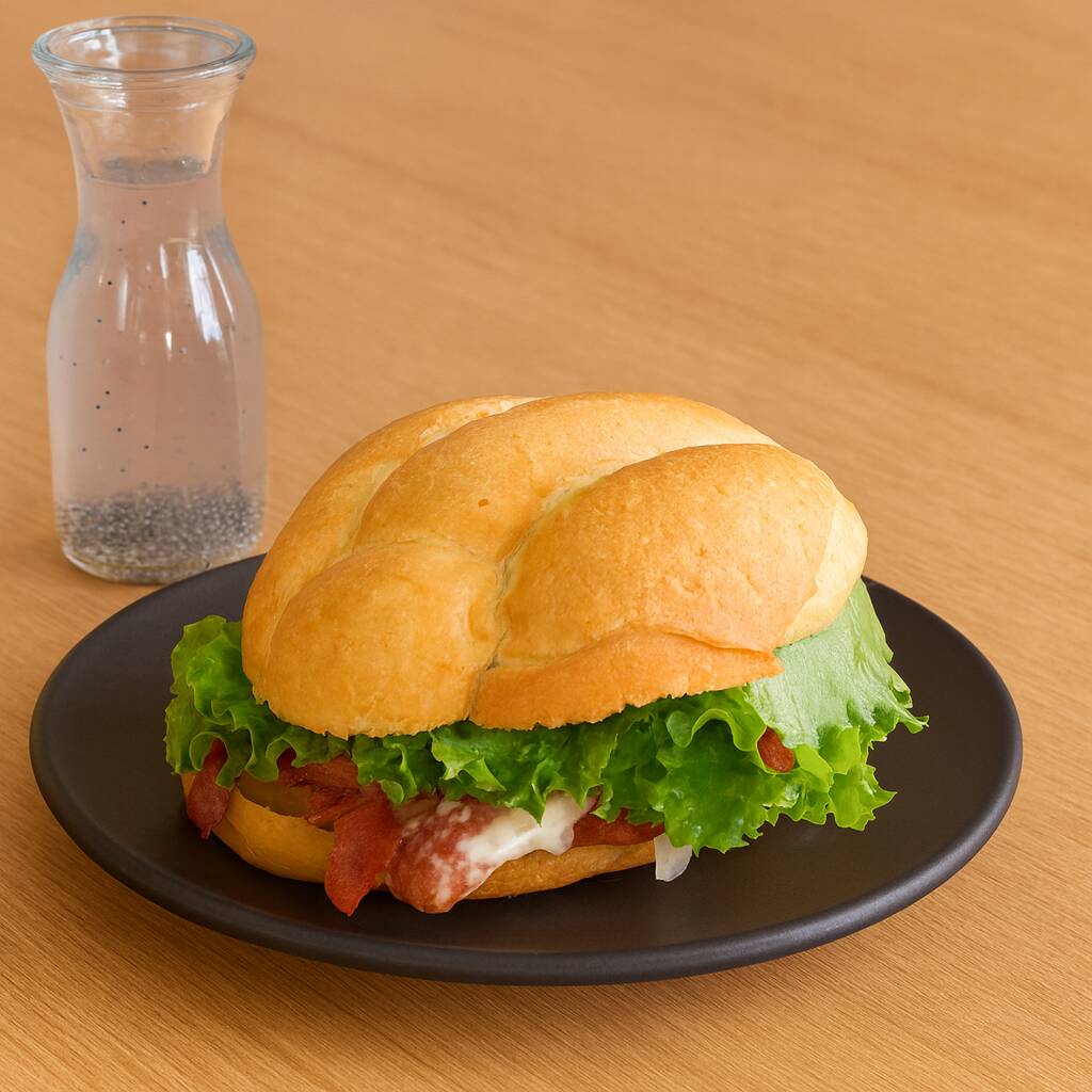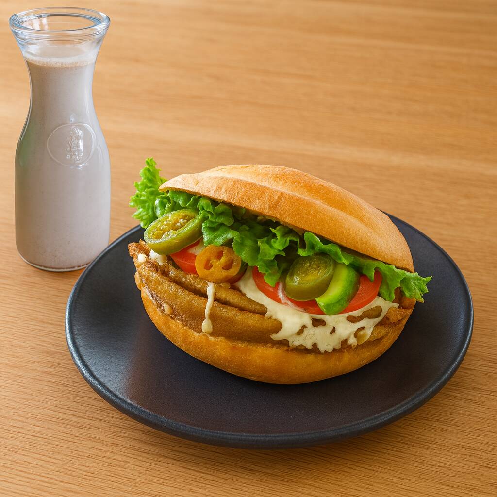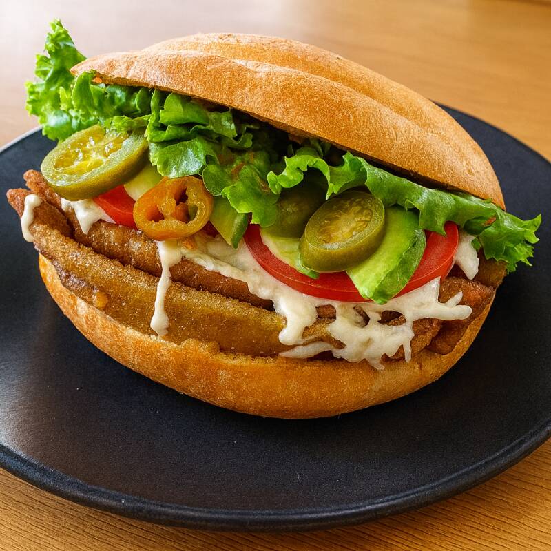 Hamburguesa con milanesa de amaranto, queso vegano, aderezo vegano, pepino, jitomate, lechuga, aderezo y rajas.