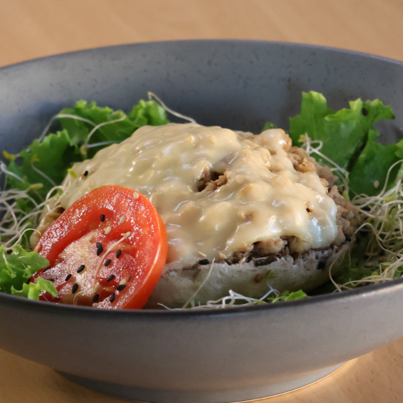 Delicioso portobello relleno de alambre vegano y queso gouda o vegano gratinado sobre una cama de lechuga y germinado de alfalfa.