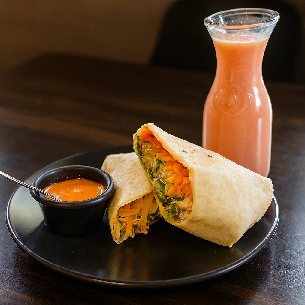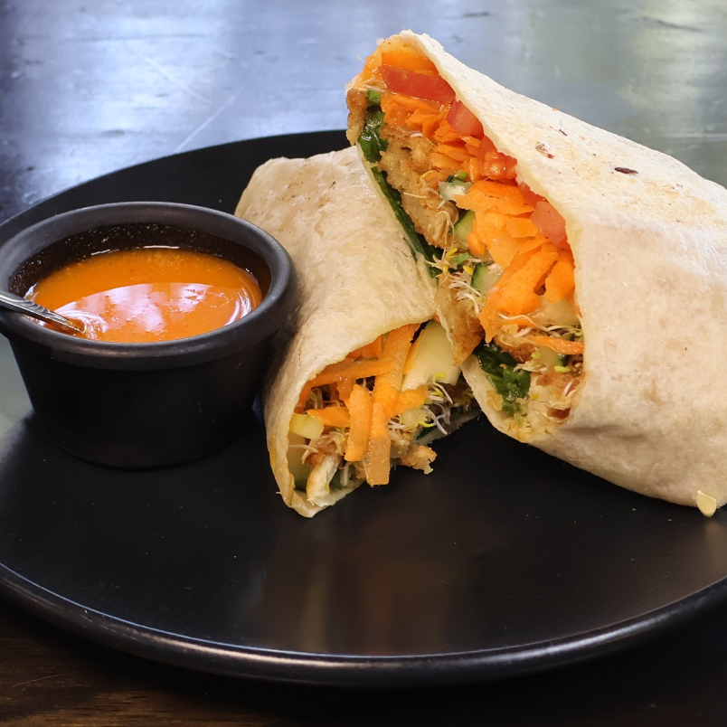 Tortilla de harina vegana rellena de milanesa de amaranto, germinado de alfalfa, lechuga italiana, aderezo de la casa, zanahoria, pepino y jitomate.
