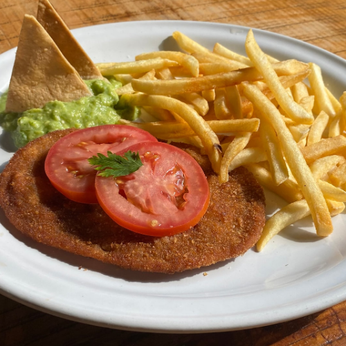 Deliciosa milanesa de amaranto vegana acompañada con guacamole de la casa y papas a la francesa.
