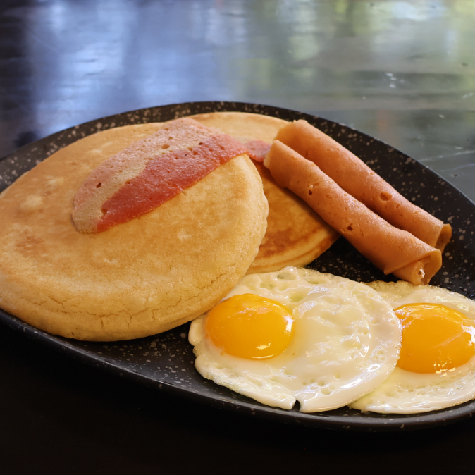 Deliciosos hot cakes veganos (2pzs) acompañados huevos al gusto o tofu, seitán tipo jamón y seitán tipo tocino.