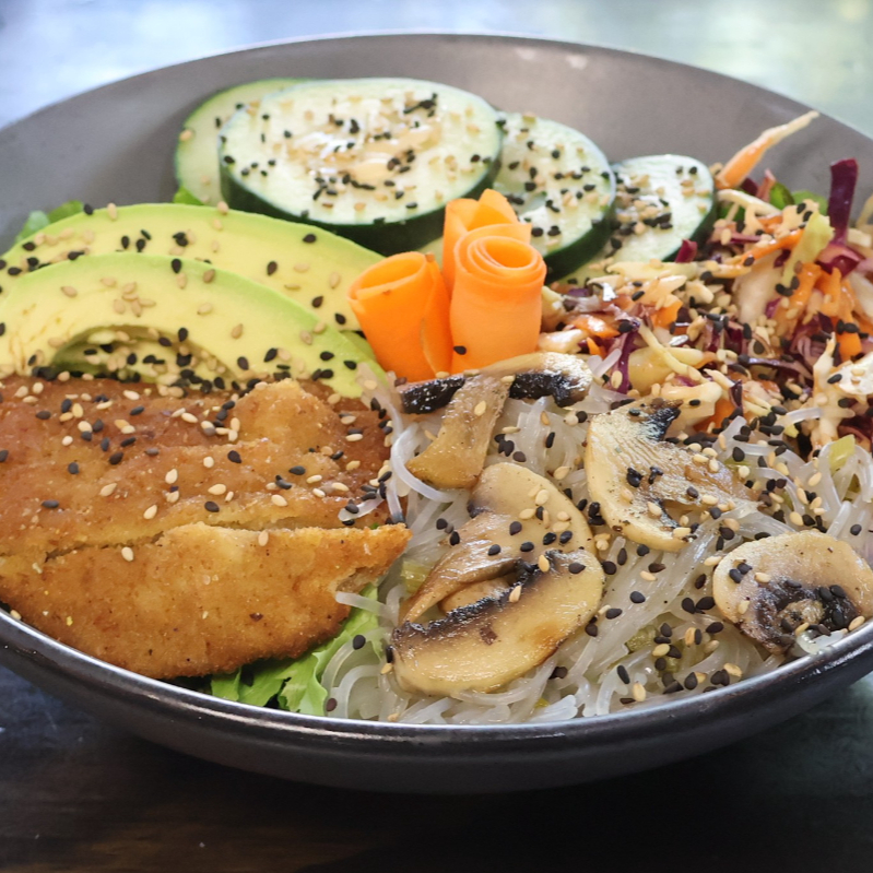 Bowl con aguacate, fideo chino, champiñones, pepino, ensalada de col, milanesa de amaranto, ajonjolí con base de lechuga italiana y arroz en cúrcuma.