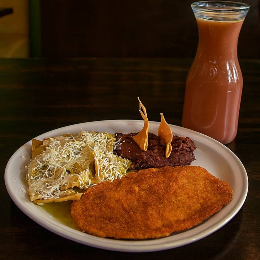 Milanesa de amaranto vegana acompañada con frijoles de la casa y exquisitos chilaquiles en salsa verde con crema y queso cotija o queso vegano.