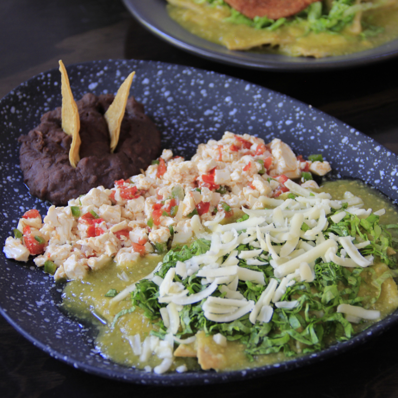 Delicioso tofu preparado a la mexicana, acompañado de chilaquiles verdes con queso vegano, lechuga, cebolla morada y frijoles.