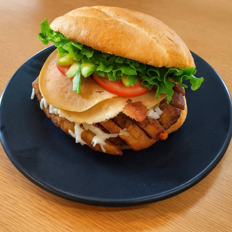 Hamburguesa acompañada de jamón vegano (seitán), piña, pepino, jitomate, lechuga, aderezo vegano, queso gouda o queso vegano.