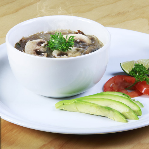 Caldillo con fideo chino y finas rebanadas de champiñón, acompañada de aguacate y perejil chino.