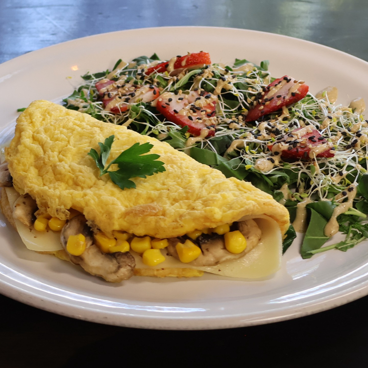 Con champiñones, elote, queso vegano o gouda, ensalada de espinaca, arúgula, germinado alfalfa, fresa, cacahuate garapiñado y aderezo ajonjolí vegano.
