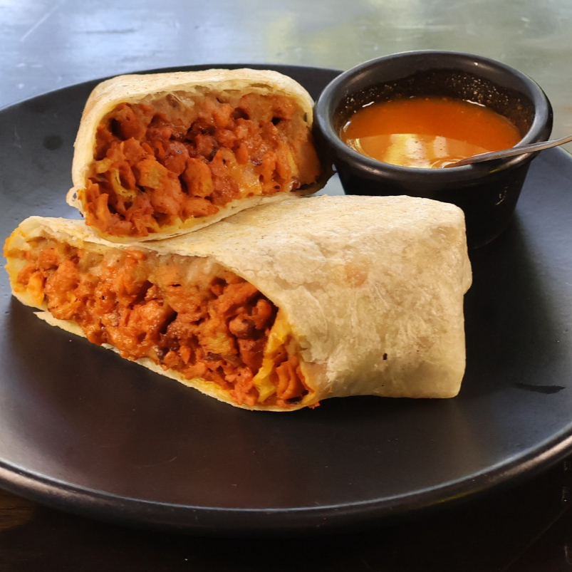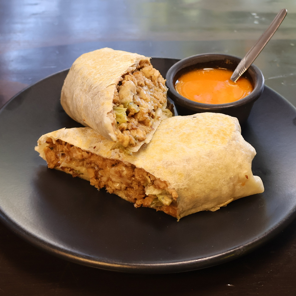 Tortilla de harina burrera rellena de alambre a base de soya (vegano) con frijolitos, ensalada de col, arroz y queso gouda o queso vegano.