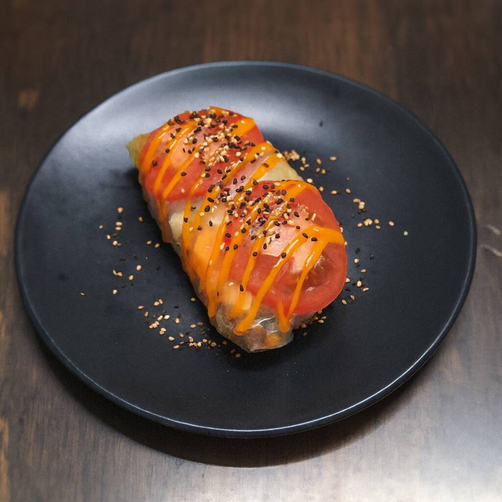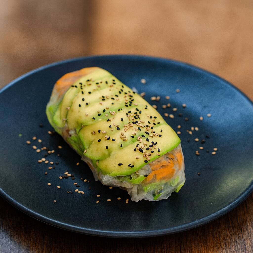 Oblea de arroz rellena de deliciosas rebanadas de aguacate, ensalada de col, fideo chino, lechuga y con una fina capa de ajonjolí.