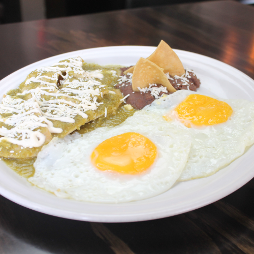 Huevos estrellados (2 piezas) sobre dos tortillas bañadas en salsa verde o roja, acompañados de frijoles.