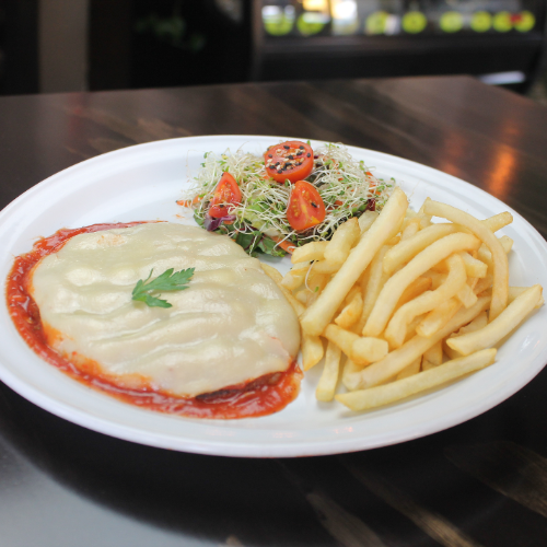 Milanesa de amaranto vegana con salsa bolognesa con queso vegano o gouda gratinado. acompañada de hojas verdes, col, germinado de alfalfa y jitomate, papas a las francesa (150g)
