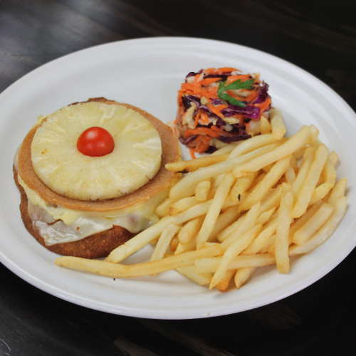 Milanesa de amaranto vegana con jamón vegano, queso vegano o queso gouda y piña. acompañada con ensalada de col y papas a la francesa (150g).