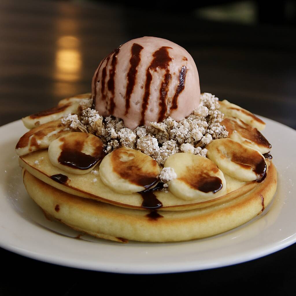 Deliciosos hot cakes veganos (2pzas) acompañados con delicadas rebanadas de plátano, granola, chocolate líquido y delicioso helado de fresa.