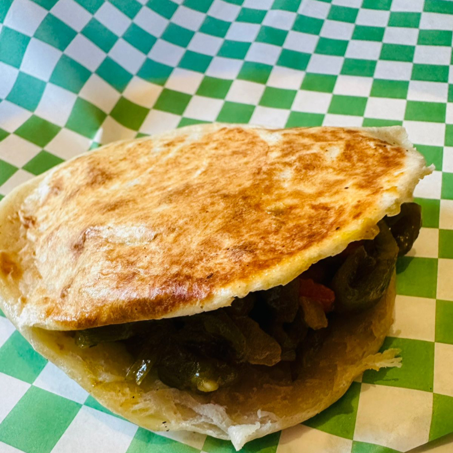 Tortilla de Harina recién hecha (grande), con queso y guiso de Rajas con Crema.