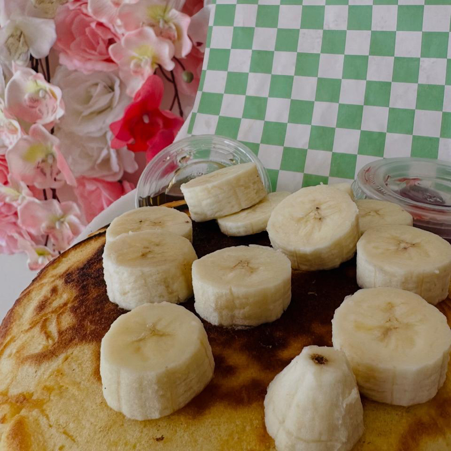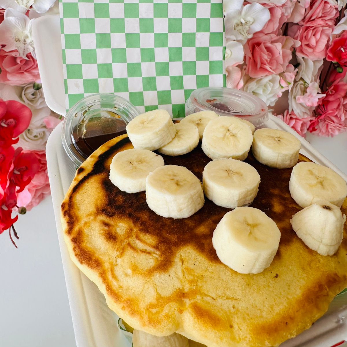 2 hotcakes preparados platano, maple y mermelada*1 + Licuado de Choco platano (Lecha Entera) 32 Oz.*1