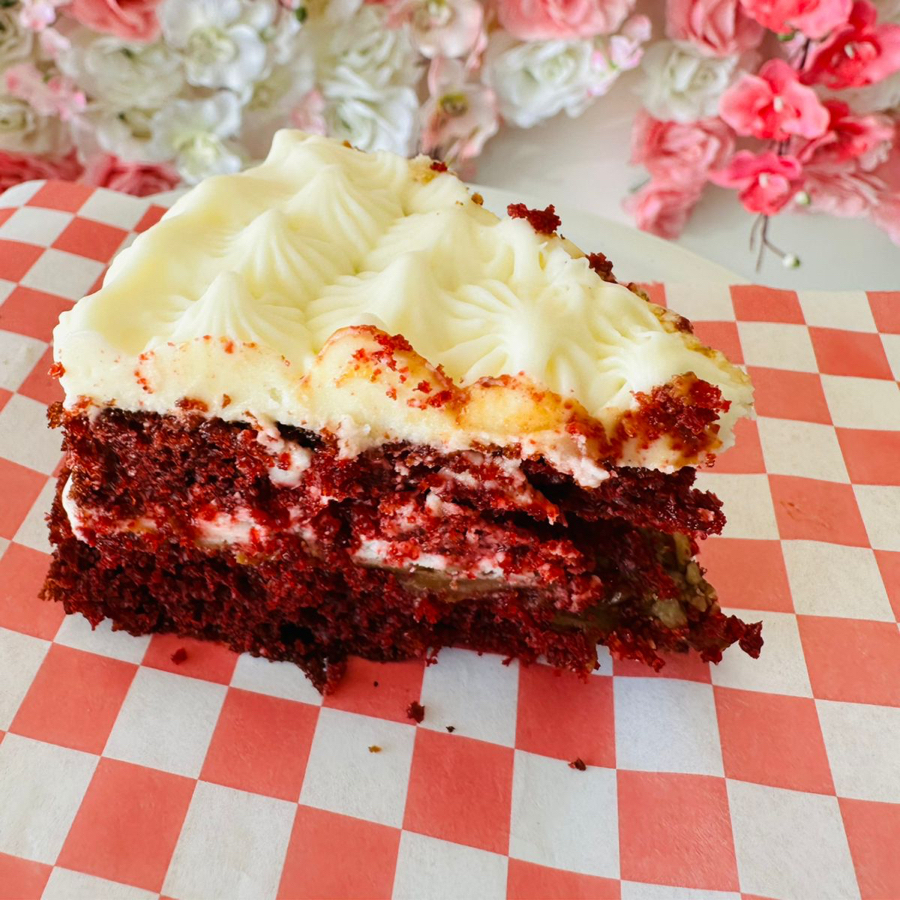 Panque red velvet, relleno dulce de leche con nuez, y betun de queso crema