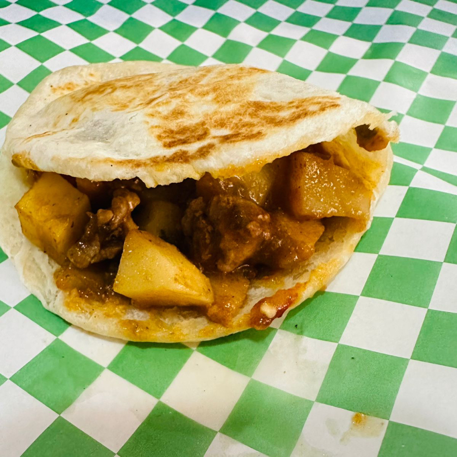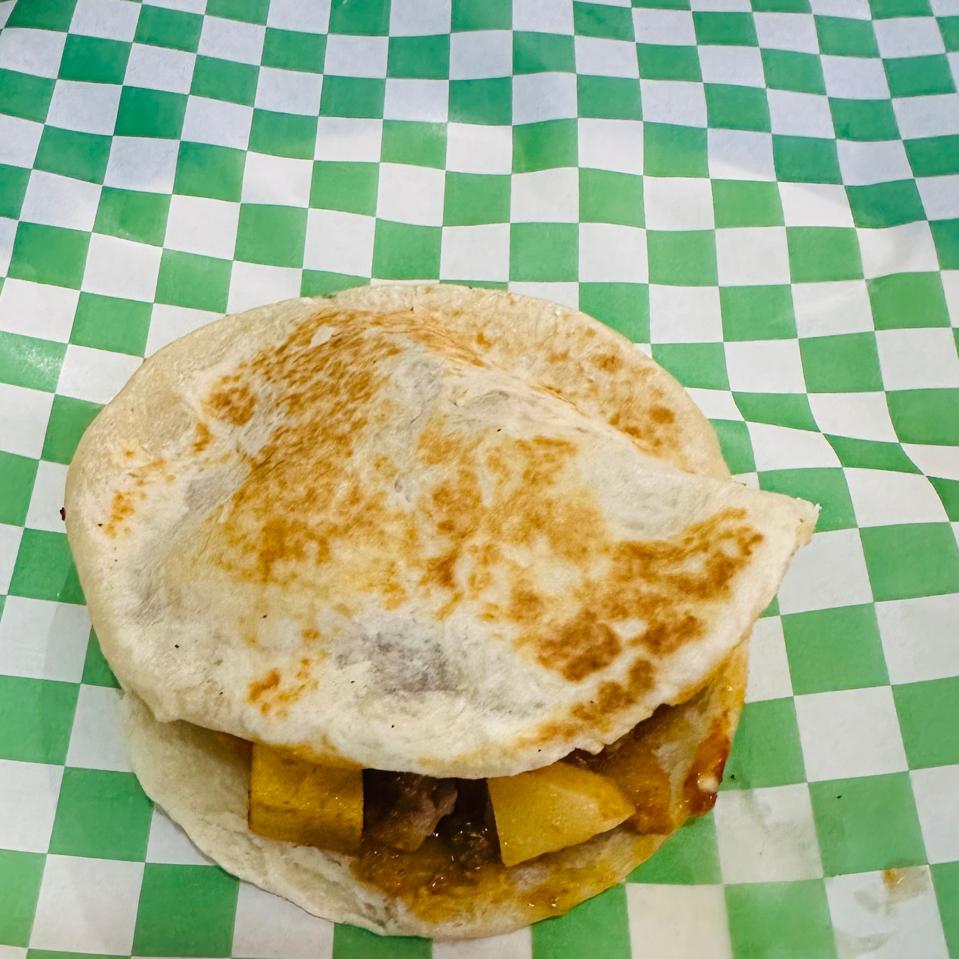 tortilla de harina casera rellena de queso con guiso de la tradicional pisada lagunera.