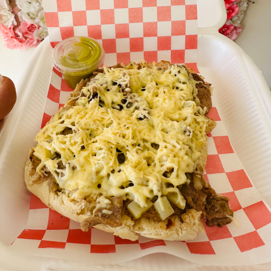 Pan francés lagunero, con mantequilla, frijoles y queso